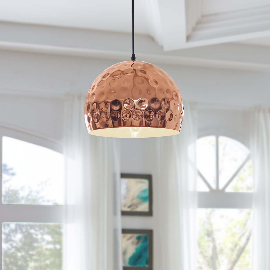 Introduce chic illumination with the Dimple Pendant Light. Suspended by an adjustable two-core braided cable, Dimple creates a delightfully distorted effect with the circular hammered detail across its steel surface. This sphere-shaped conversation starter is crafted with rose-gold plated iron and features a contrasting white underside. Dimple is designed for use with a single 60W light bulb (not included). Set Includes: One - Dimple 13.5" Half-Sphere Rose Gold Pendant Light Hammered Pendant Light Rose Gold Steel Shade and Ceiling Plate Adjustable Two-Core Braided Cable Requires One E26 60W Bulb (not included) UL Listed and Approved Overall Product Dimensions: 13.5"L x 13.5"W x 78.5"H