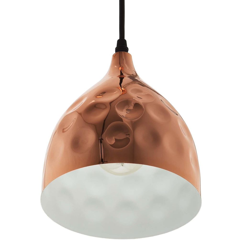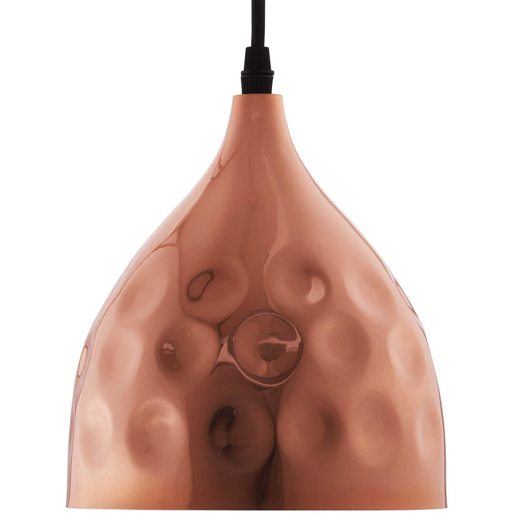 Introduce chic illumination with the Dimple Pendant Ceiling Light. Suspended by an adjustable two-core braided cable, Dimple creates a delightfully distorted effect with the circular hammered detail across its steel surface. This bell-shaped conversation starter is crafted with rose-gold plated iron and features a contrasting white underside. Takes one single 60W light bulb (not included). Set Includes: One - Dimple 6.5" Bell-Shaped Rose Gold Pendant Light Hammered Pendant Light Rose Gold Steel Shade and Ceiling Plate Adjustable Two-Core Braided Cable Requires One E26 60W Bulb (not included) UL Listed and Approved Overall Product Dimensions: 6.5"L x 6.5"W x 78.5"H
