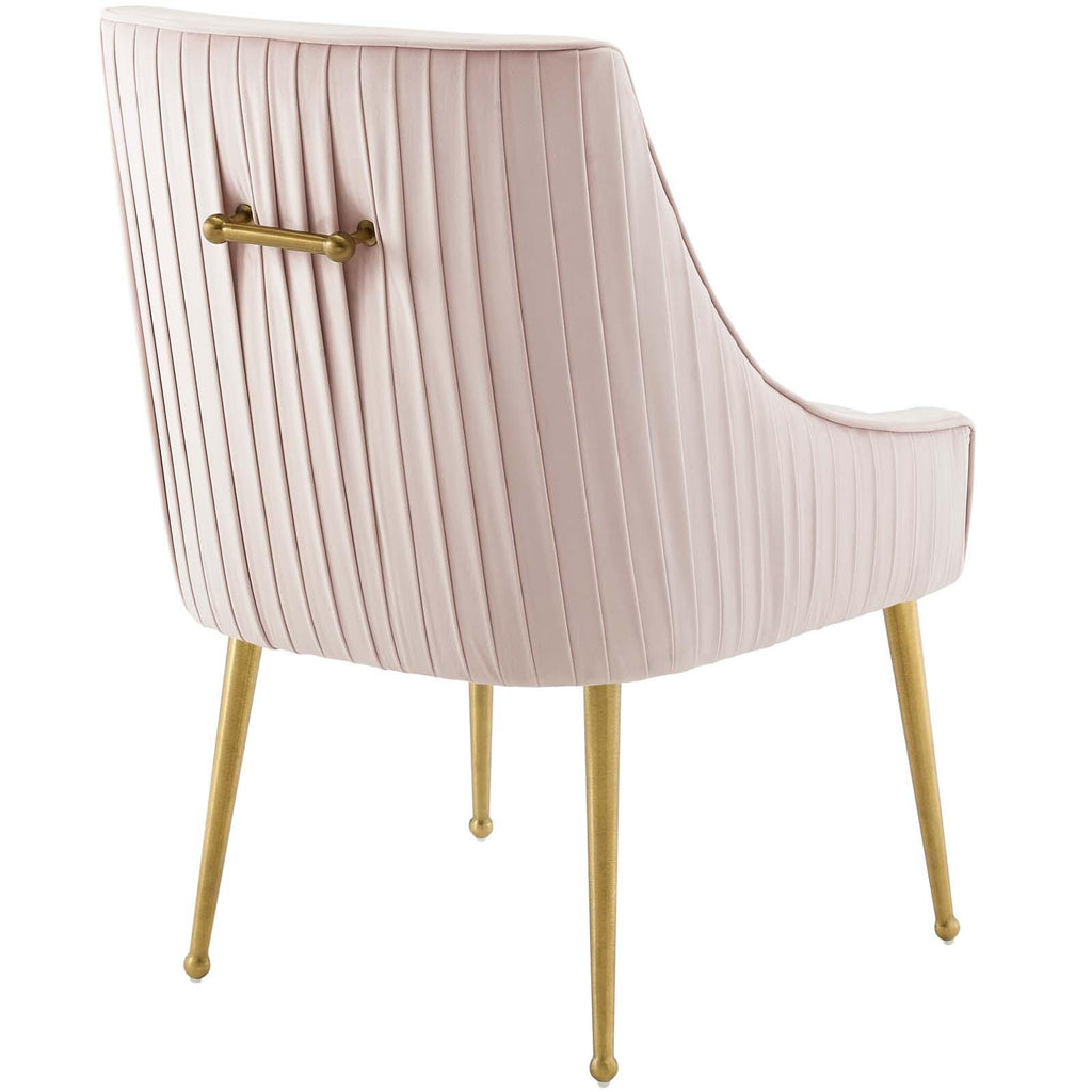 Gently sloping arms cascade down from the flowing design of the Discern Performance Velvet Pleated Back Dining Chair Set of 2. Solidly constructed from wood and plywood, Discern comes with dense foam padding upholstered in stain-resistant performance velvet. Complete with splayed brushed gold stainless steel legs and matching decorative handle on the back of the chair, Discern is a soft and durable addition to the dining room, kitchen entryway, living room, bedroom, home office, or vanity. Create a cozy seating experience with this versatile dining accent chair set complete with non-marking foot caps.