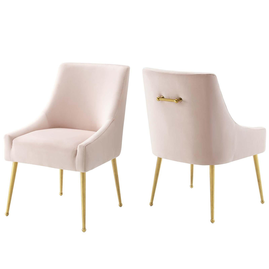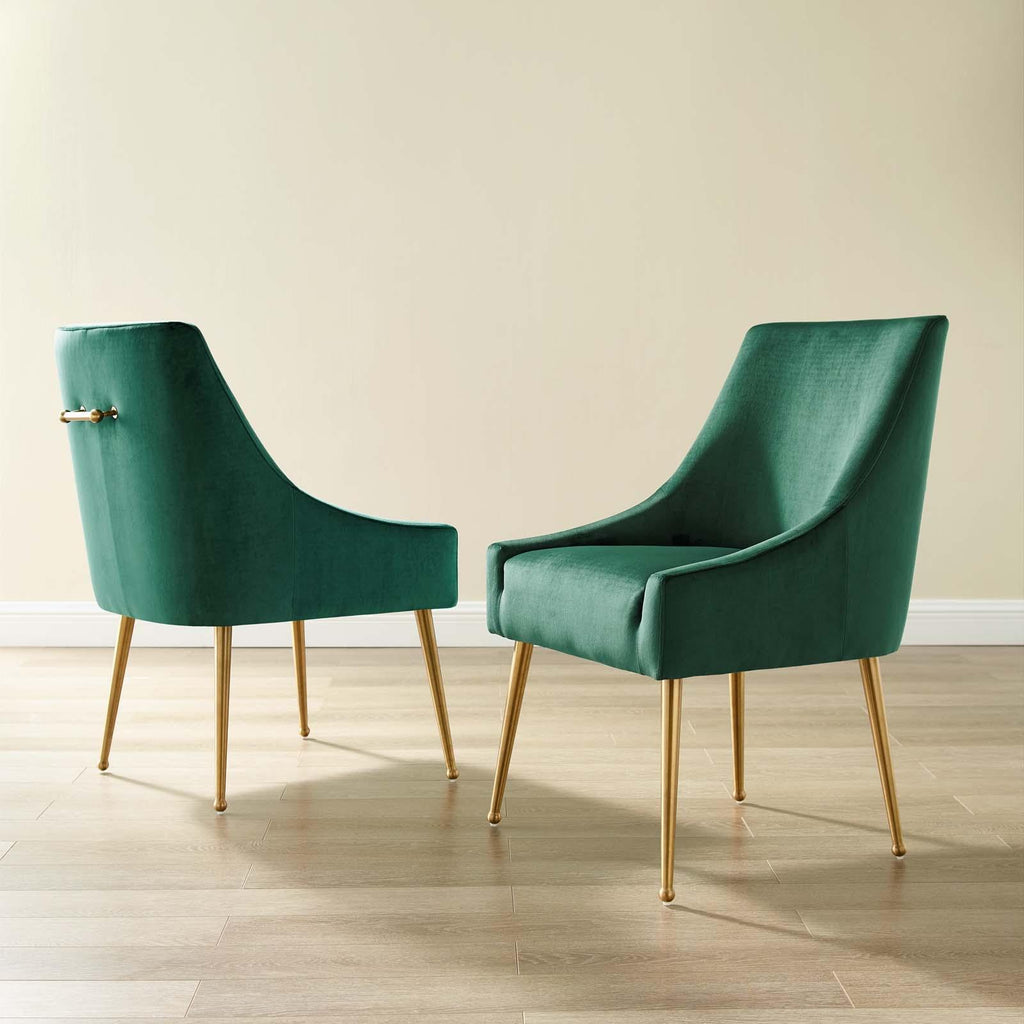 Gently sloping arms cascade down from the flowing design of the Discern Performance Velvet Dining Chair Set of 2. Solidly constructed from wood and plywood, Discern comes with dense foam padding upholstered in stain-resistant performance velvet. Complete with splayed brushed gold stainless steel legs and matching decorative handle on the back of the chair, Discern is a soft and durable addition to the dining room, kitchen entryway, living room, bedroom, home office, or vanity. Create a cozy seating experience with these versatile dining accent chairs complete with non-marking foot caps. Set Includes: Two - Discern Dining Chair Dining Room or Accent Chair Set of 2 Velvet Polyester Upholstery Durable Stain-Resistant Fabric Brushed Gold Stainless Steel Dense Foam Padding Non-Marking Foot Caps Chair Weight Capacity: 300 lbs Overall Product Dimensions: 22"L x 50"W x 34"H Individual Chair Dimensions: 22"L x 25"W x 34"H Backrest Dimensions: 19.5"W x 17"H Armrest Height: 19"H Base Dimensions: 19.5"L x 21"W