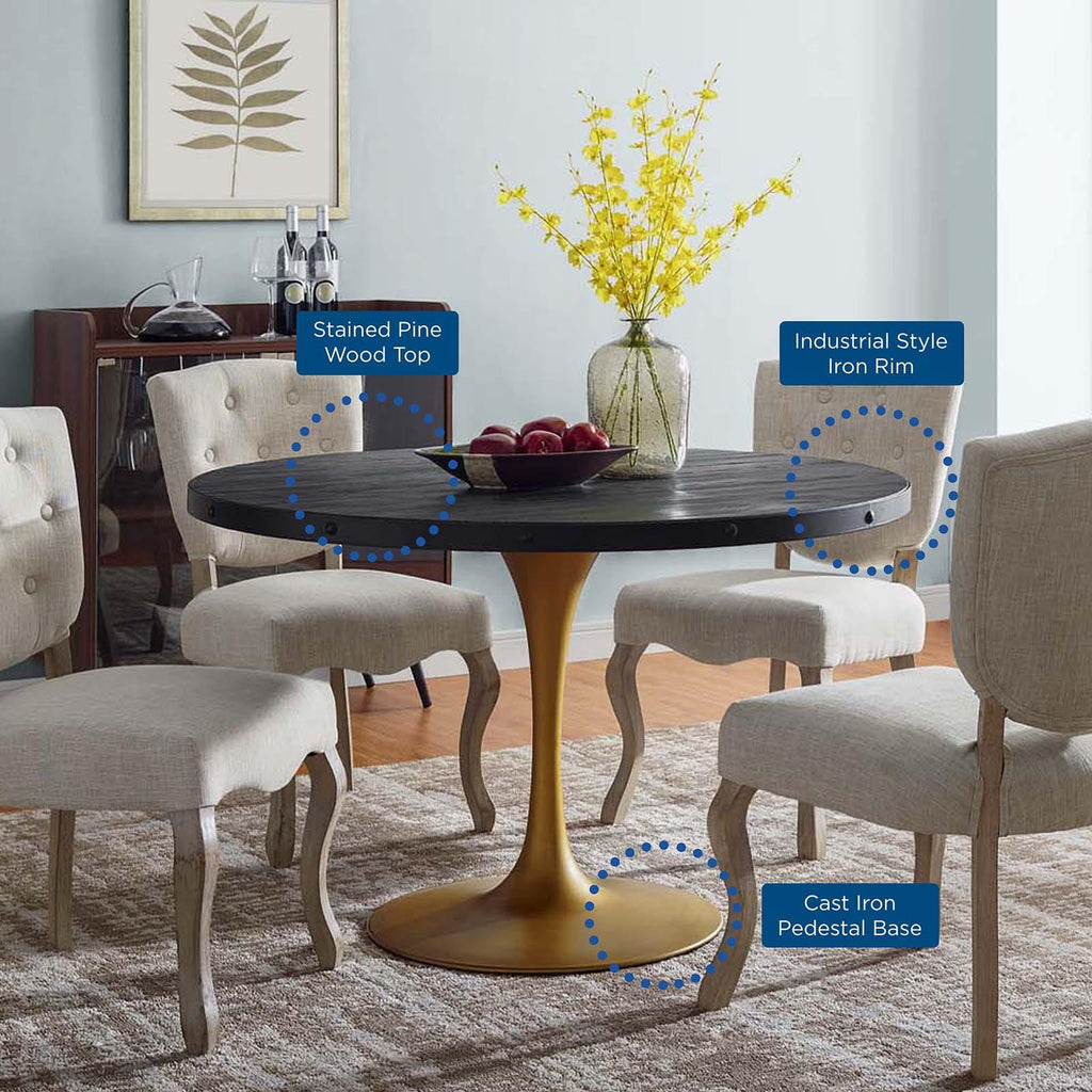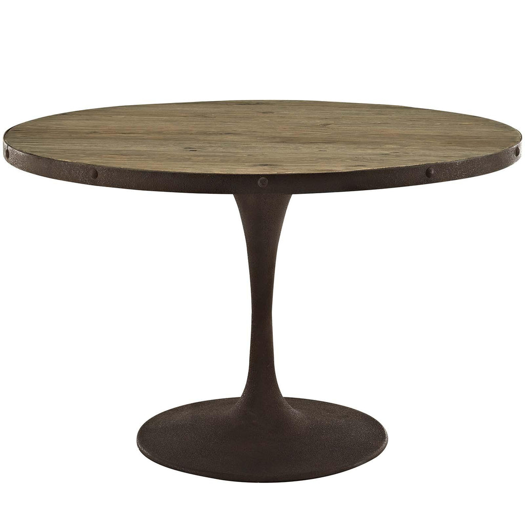 Deliberately implement down-to-earth aesthetics with the Drive industrial modern round dining table. Fashioned on a cast iron pedestal base, the round pine top is braced in a rim of iron to connote progress amidst rustic conditions. In contrast to the standard four-legged tables, the single stand variety has been gaining popularity over the past 60 years. Now with the resurgence of industrial modernism, the warehouse of yesteryear comes remodeled into its present stance as an art form.