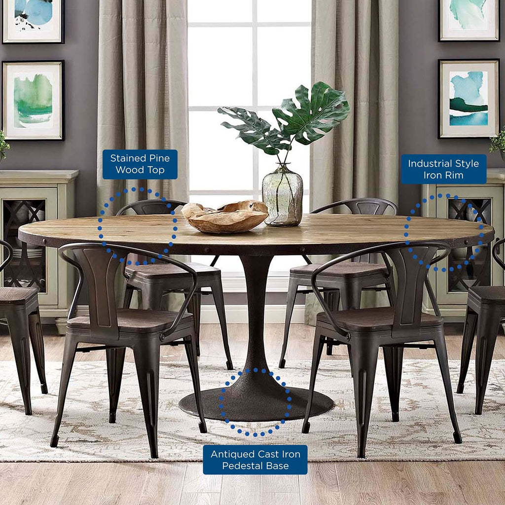 Deliberately implement down-to-earth aesthetics with the Drive industrial modern oval dining table. Fashioned on a cast iron pedestal base, the oval pine top is braced in a rim of iron to connote progress amidst rustic conditions. In contrast to the standard four-legged tables, the single stand variety has been gaining popularity over the past 60 years. Now with the resurgence of industrial modernism, the warehouse of yesteryear comes remodeled into its present stance as an artform.