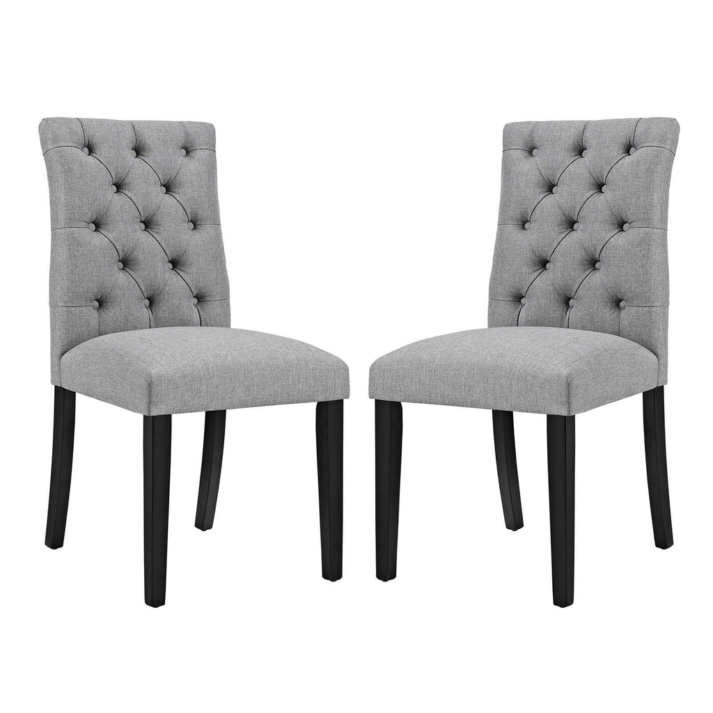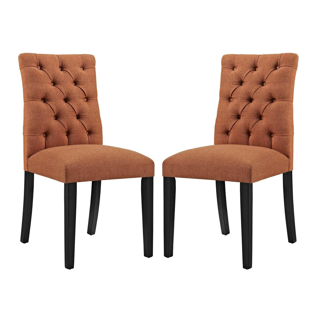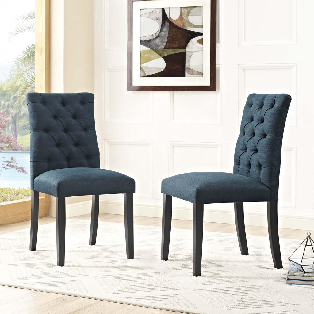 Bestow elegance with the Duchess Dining Chair. Chic and luxurious, Duchess features a stylish curvy form, richly tufted button back, dense foam padding, fine fabric upholstery, and wood legs topped with non-marking foot caps. Resonate grace and charm with a dining chair perfect for the modern home.