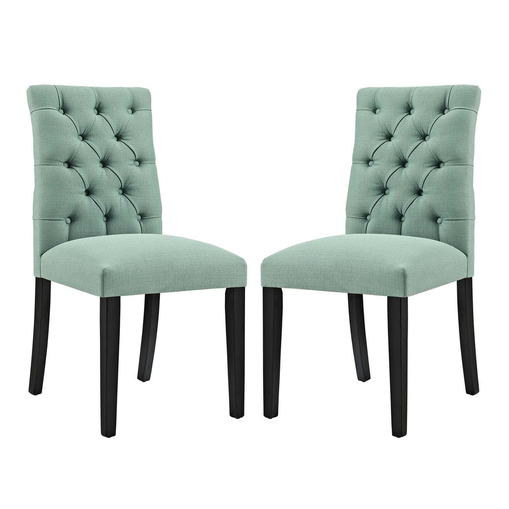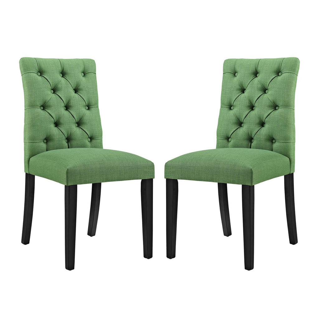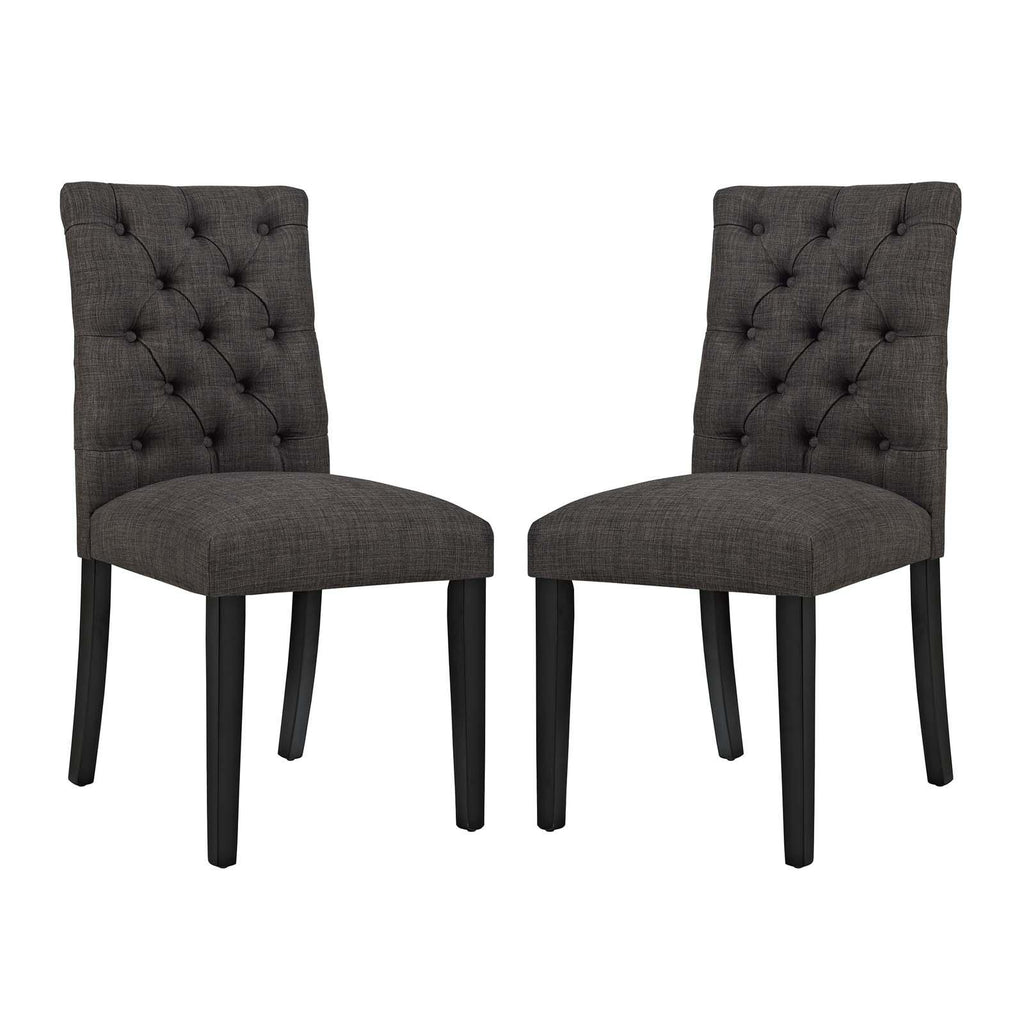 Bestow elegance with the Duchess Dining Chair. Chic and luxurious, Duchess features a stylish curvy form, richly tufted button back, dense foam padding, fine fabric upholstery, and wood legs topped with non-marking foot caps. Resonate grace and charm with a dining chair perfect for the modern home.