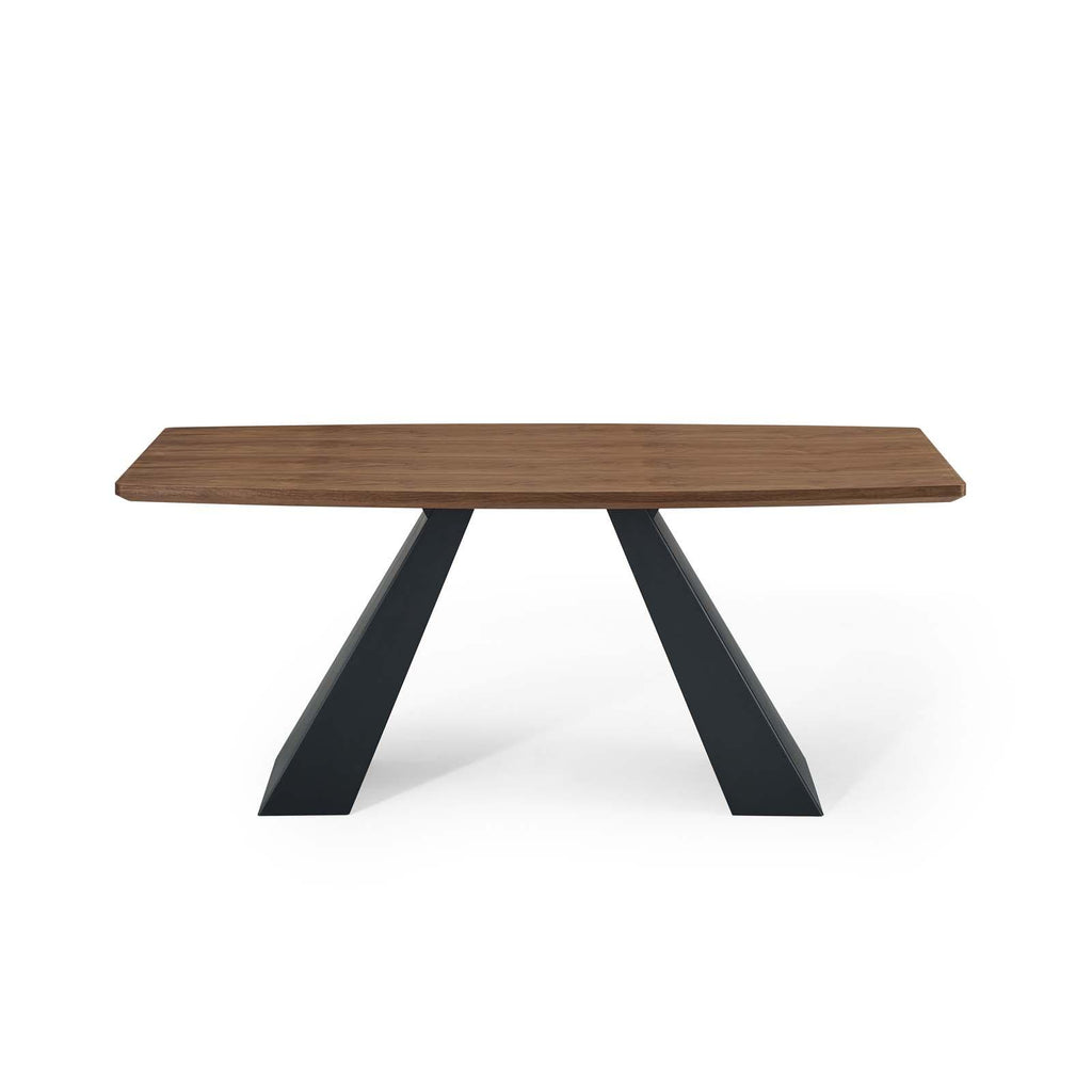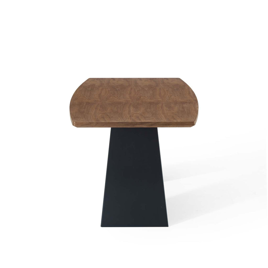Angular expanse rises gracefully from the Elevate 71� Dining Room Table. The rectangular walnut grain veneer top with subtle curved edges is supported by a triangulated matte black iron base with non-marking foot caps. The Elevate Dining Table is an eye-catching addition to your dining room and kitchen decor, and its versatile construction features elegance suitable for an executive conference room. Solidly crafted from wood and MDF, this dining table boasts sloped edges and striking angular detail. Assembly Required.