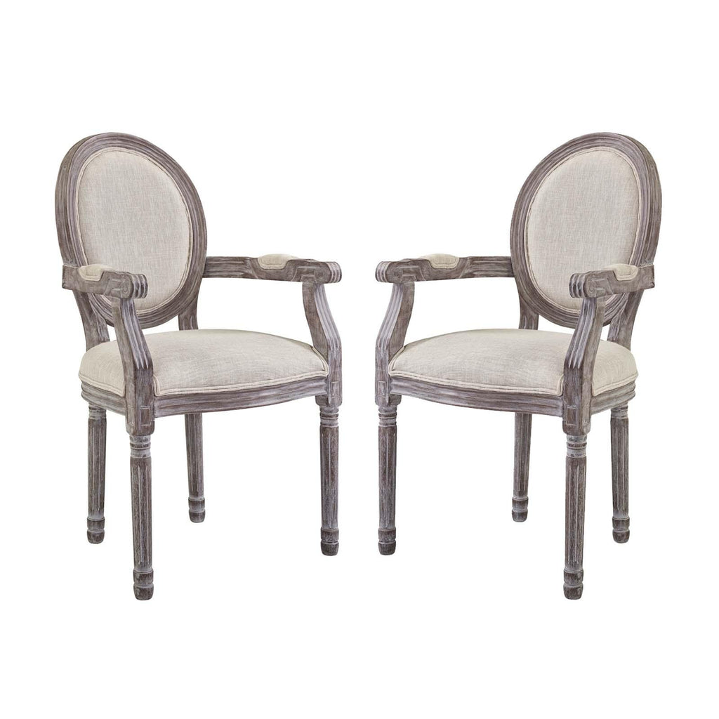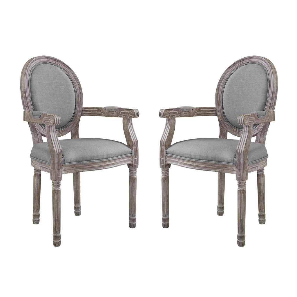 Revel in the whispered opulence of the Emanate Dining Armchair. Featuring a fluted wood frame, dense foam upholstered fabric seat and scooped armrests, this oval back dining or accent chair elegantly blends old world charm with modern intrigue. Designed with a weathered vintage French look and an undeniable appeal, Emanate supports up to 331 pounds and comes with foot pads to preserve flooring. Comes fully assembled. Set Includes: Two - Emanate Dining Armchair Vintage French Dining Armchair Polyester Fabric Upholstery Louis XVI Chair Design Dense Foam Padding Fluted Solid Wood Frame Comes Fully Assembled Chair Weight Capacity: 331 lbs Overall Product Dimensions: 22"L x 22"W x 37.5"H Overall Armchair Dimensions: 22"L x 22"W x 37.5"H Seat Dimensions: 19"L x 16.5"W x 20"H Armrest Dimensions: 22"L x 26"H Backrest Dimensions: 15.5"L x 19"H