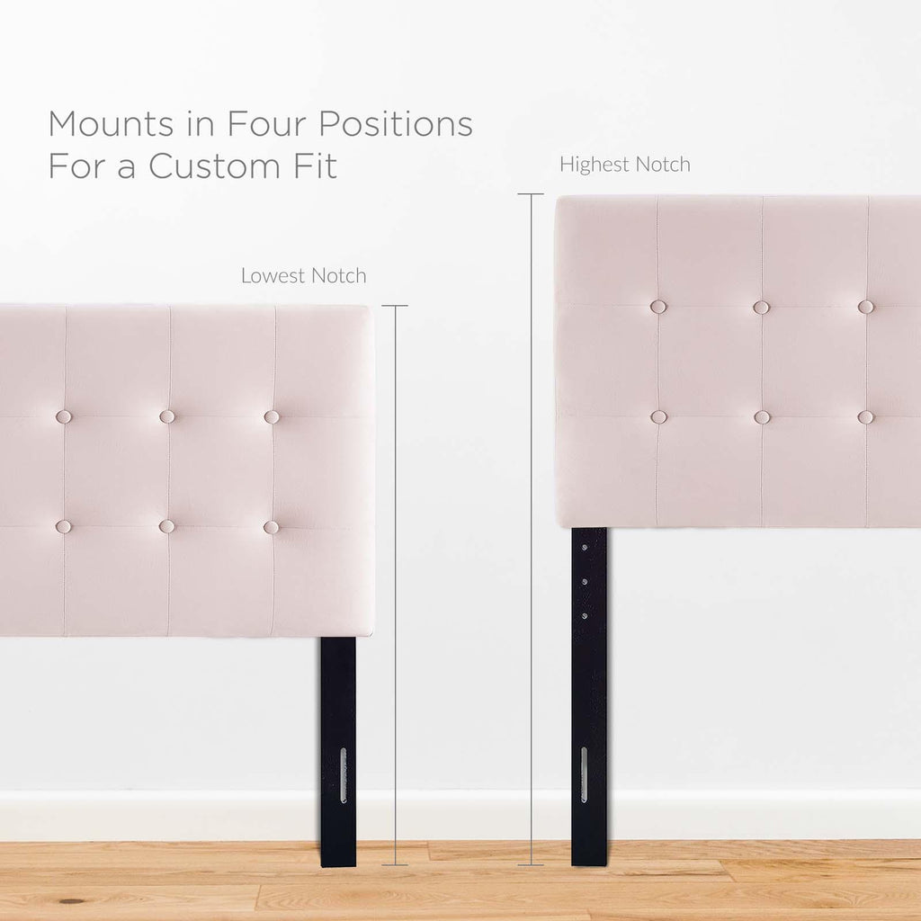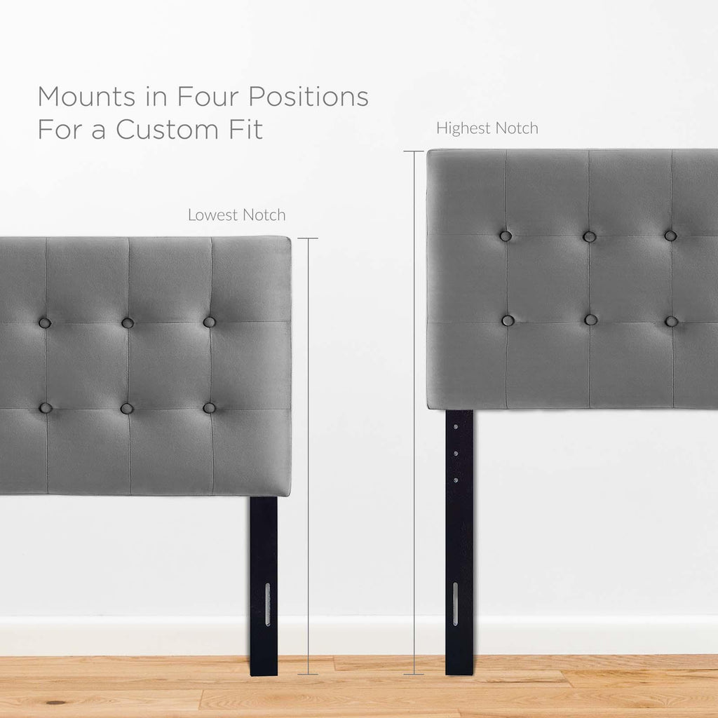Instill classic elegance and modern luxury with the Emily Biscuit Tufted Performance Velvet Twin Headboard Headboard. Emily features beautiful biscuit button tufting for plush vintage glamour and timeless appeal. An elegant centerpiece to a kid's bedroom, guest room, or dorm, this upholstered velvet headboard for twin bed frames provides a soft, stain-resistant update for premium comfort while relaxing, reading, or conversing in bed. Solidly constructed from plywood and fiberboard with dense foam padding, this twin size velvet headboard comes with five mounting positions that are height adjustable from 45" - 52.5".