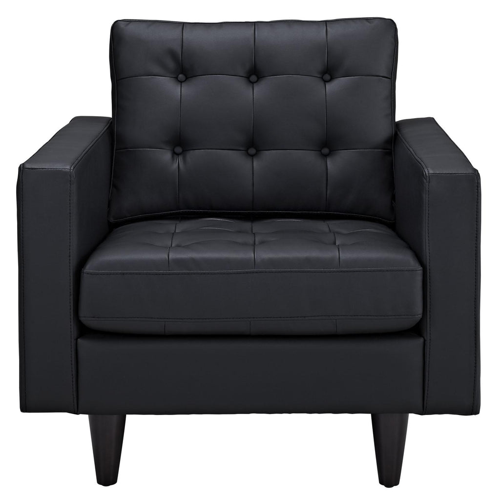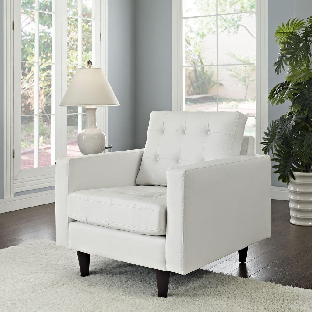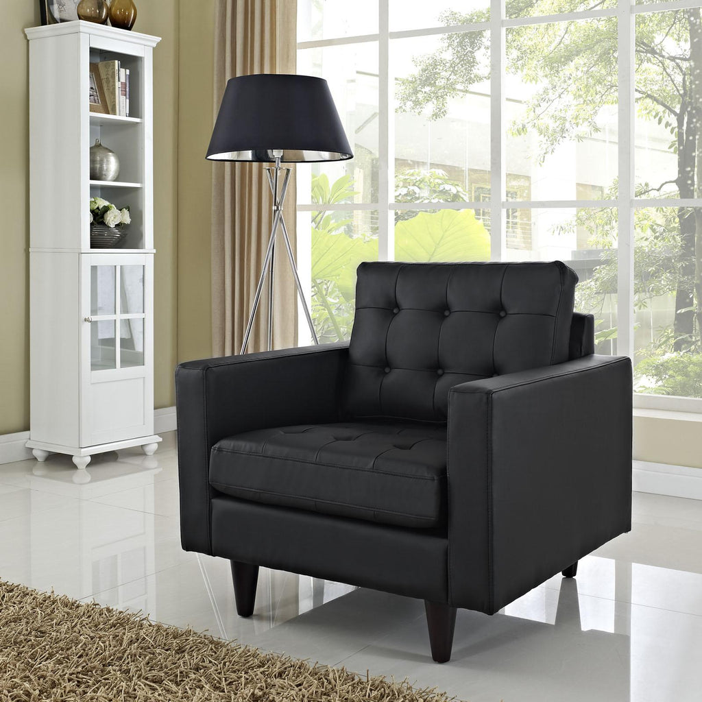 End the rule of unjust sovereignties that wage a useless war for your interiors. Empress leaves the would-be heiress of holistic furnishings in the dust with a design that rivals any competitor. Empress is heralded with deeply tufted buttons, plush cushions, and armrests that convey that perfect air of nobility. The solid wood legs come with plastic glides to prevent floor scratching, and the bonded leather upholstery leaves the recipients feeling richly rewarded. Set Includes: One - Empress Leather Armchair Modern Armchair Deeply tufted buttons Bonded leather Solid wooden legs Glides to prevent scratching. Chair Weight Capacity: 440 pounds Overall Product Dimensions: 35.5"L x 35.5"W x 34.5"H Seat Dimensions: 23"L x 26"W x 19"H Armrest Dimensions: 4.5"W x 6.5"H Backrest Height: 18.5"H Cushion Thickness: 6"H