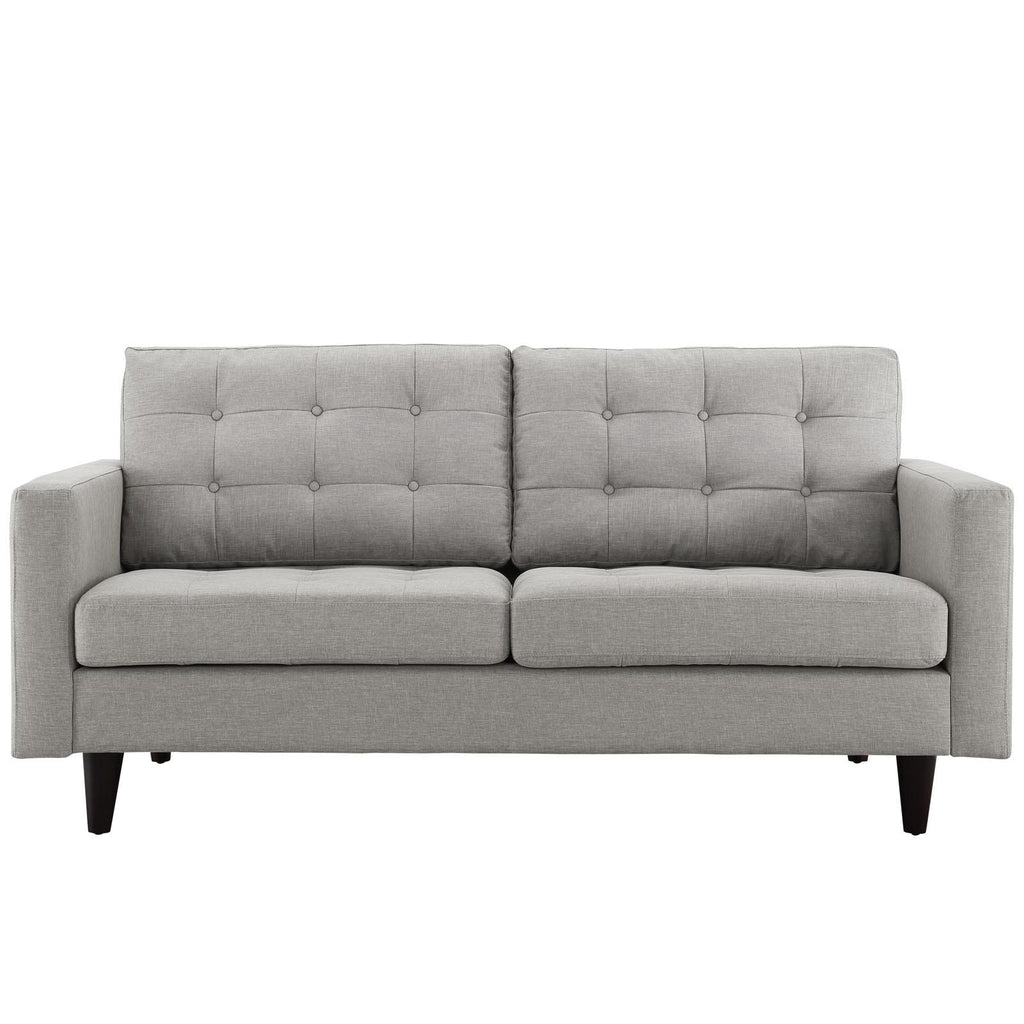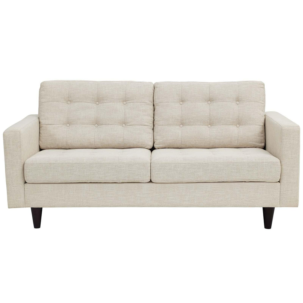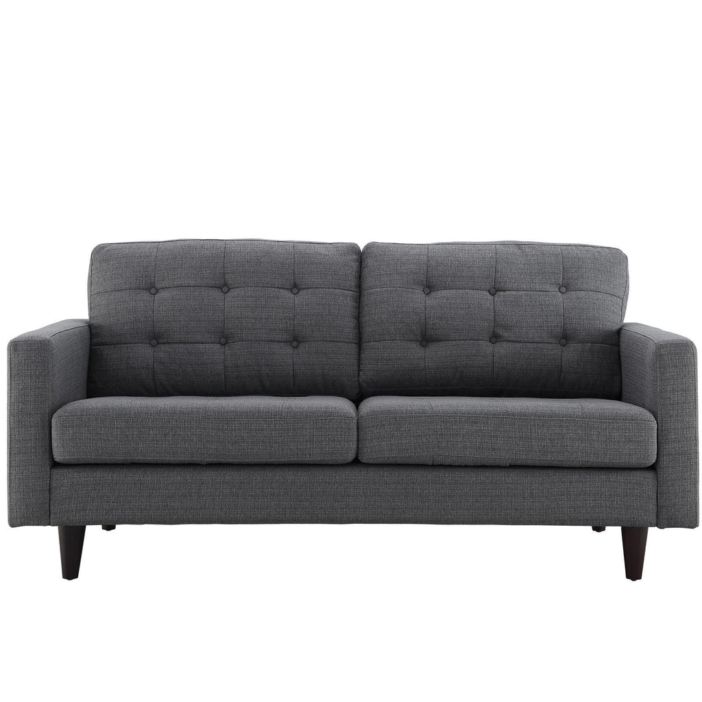 End the rule of unjust sovereignties that wage a useless war for your interiors. Empress leaves the would-be heiress of holistic furnishings in the dust with a design that rivals any competitor. Empress is heralded with deeply tufted buttons, plush cushions, and armrests that convey that perfect air of nobility. The solid wood legs come with plastic glides to prevent floor scratching, and the fine fabric upholstery leaves the recipients feeling richly rewarded.
