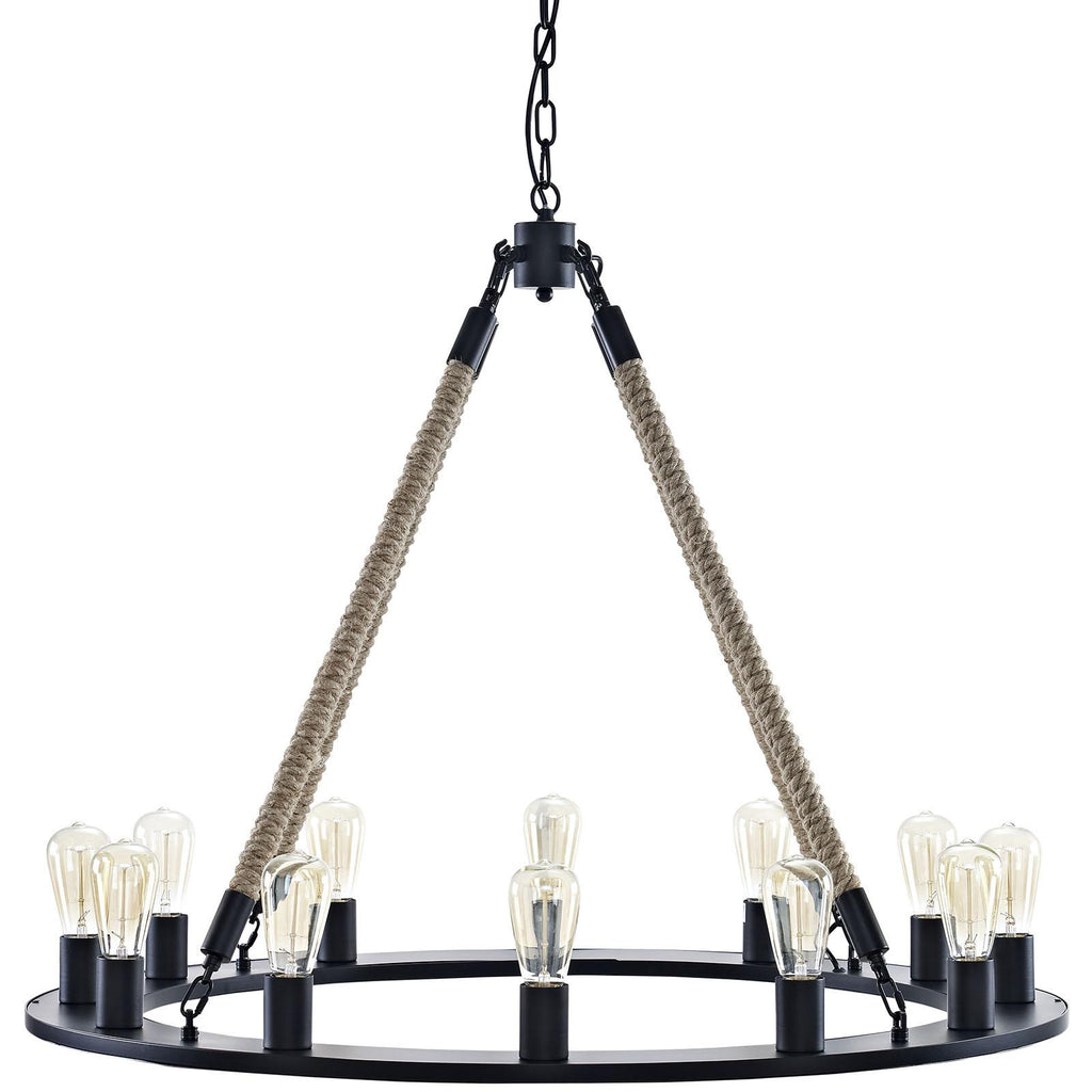 Cruise on a light-filled course with the Encircle Chandelier. Supported by four rope cords with steel hooks and adorned with a magnificent array of light bulbs, Encircle takes you from one lap in the journey to the next with distinction. Held by an adjustable steel chain, and designed to imbue momentum over your entire dining room, dine amongst friends and family while seated in front of this radiant tour of positivity. The Encircle Chandelier works best in rustic, ranch, vintage modern, industrial modern, and other transitional d�cors. Set Includes: One - Encircle Chandelier Vintage Modern Chandelier Rope and Steel Construction Adjustable 34� Steel Chain Cord Eight E26 60 Watt Bulbs (Not Included) 110 Volt Assembly Required Overall Product Dimensions: 31.5"L x 31.5"W x 31.5"H Bottom to the Top of the Shade: 34"H Base Width: 31.5"W Width of Shade: 6"W Chain length: 34"L Bar Length: 29"L