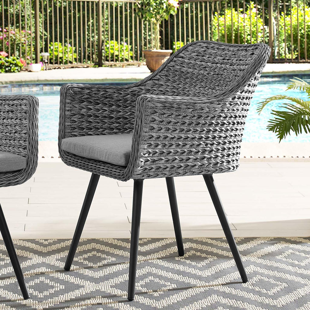 Gather family and friends to indulge in good weather and a premium lounge experience with the Endeavor Outdoor Patio Collection. Sporting a stylish contemporary modern look, Endeavor Patio Dining Armchair features waterproof, black powder-coated aluminum legs and non-marking foot caps. A designer gray-on-gray tone synthetic rattan weave perfect for enhancing al fresco dining in the balcony, garden, backyard, and patio make Endeavor Outdoor Dining Armchair a vital outdoor decor piece. This dining armchair comes with all-weather cushions and offers long-lasting comfort when relaxing or entertaining.