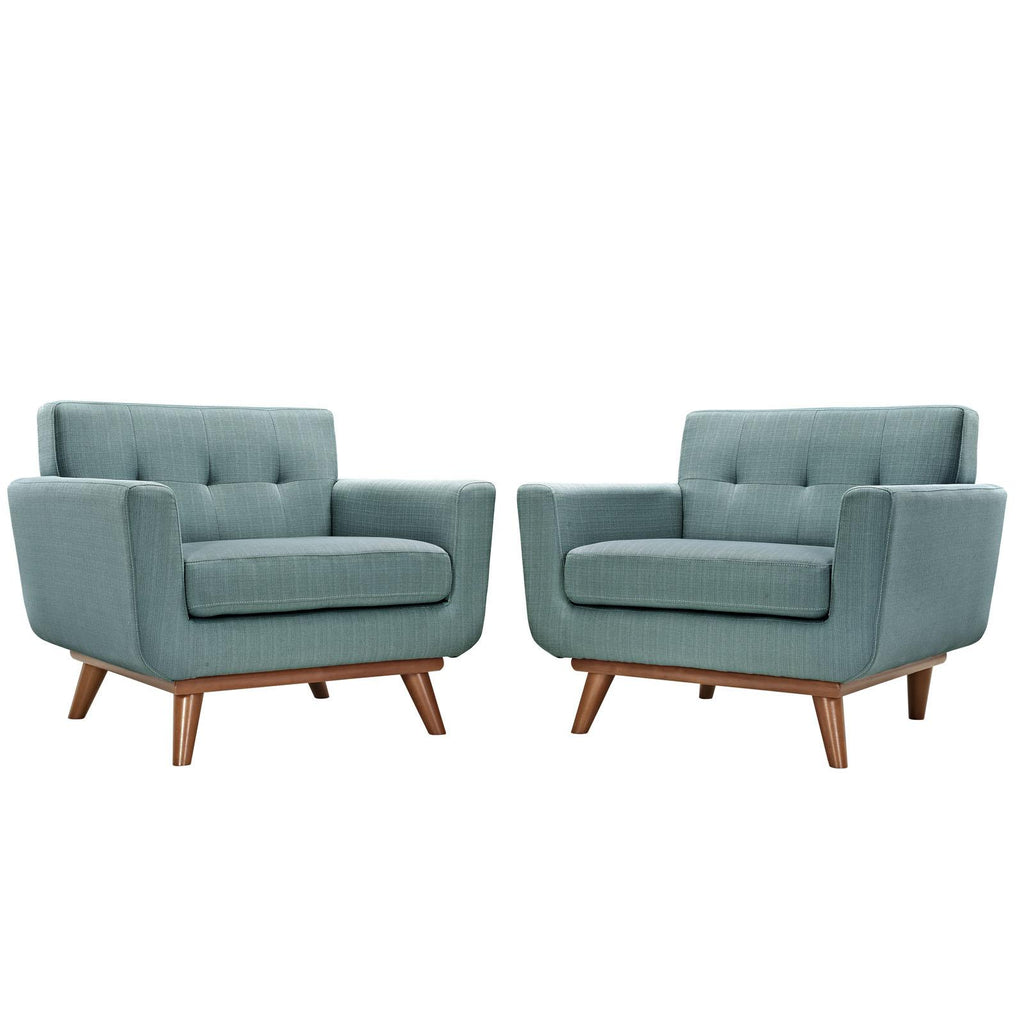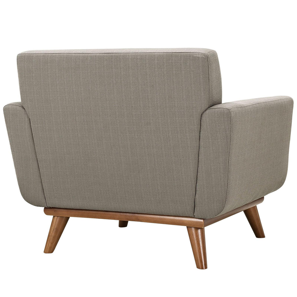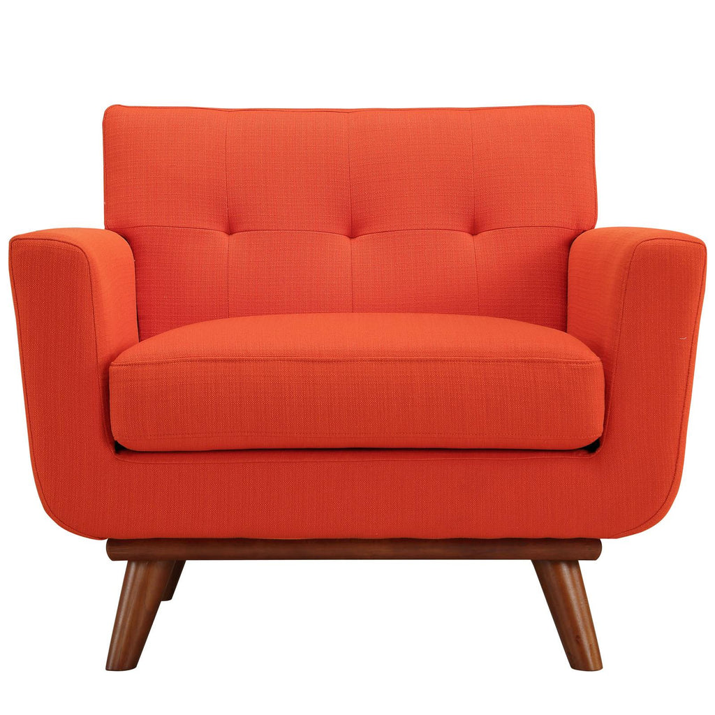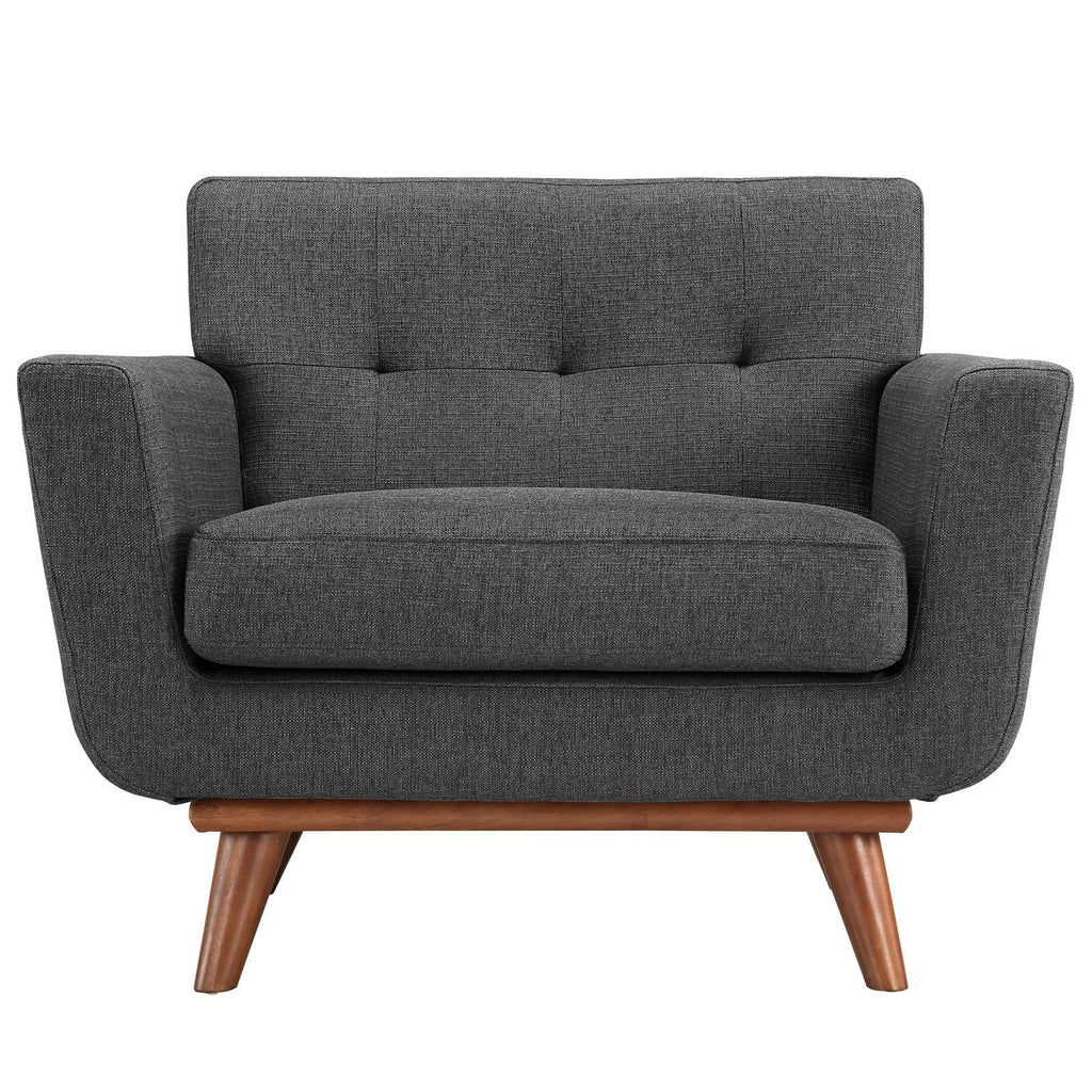 Gently sloping curves and large dual cushions create a favorite lounging spot. Whether plopping down after a long day at work, settling in with coffee and brunch, or entering a spirited discussion with friends, the Engage armchair is a welcome presence in your home. Seven tufted buttons create eye-catching appeal, adding depth that brings your sitting d�cor to center stage. Four cherry color rubberwood legs and frame supply a solid base to the comfortable upholstered material.