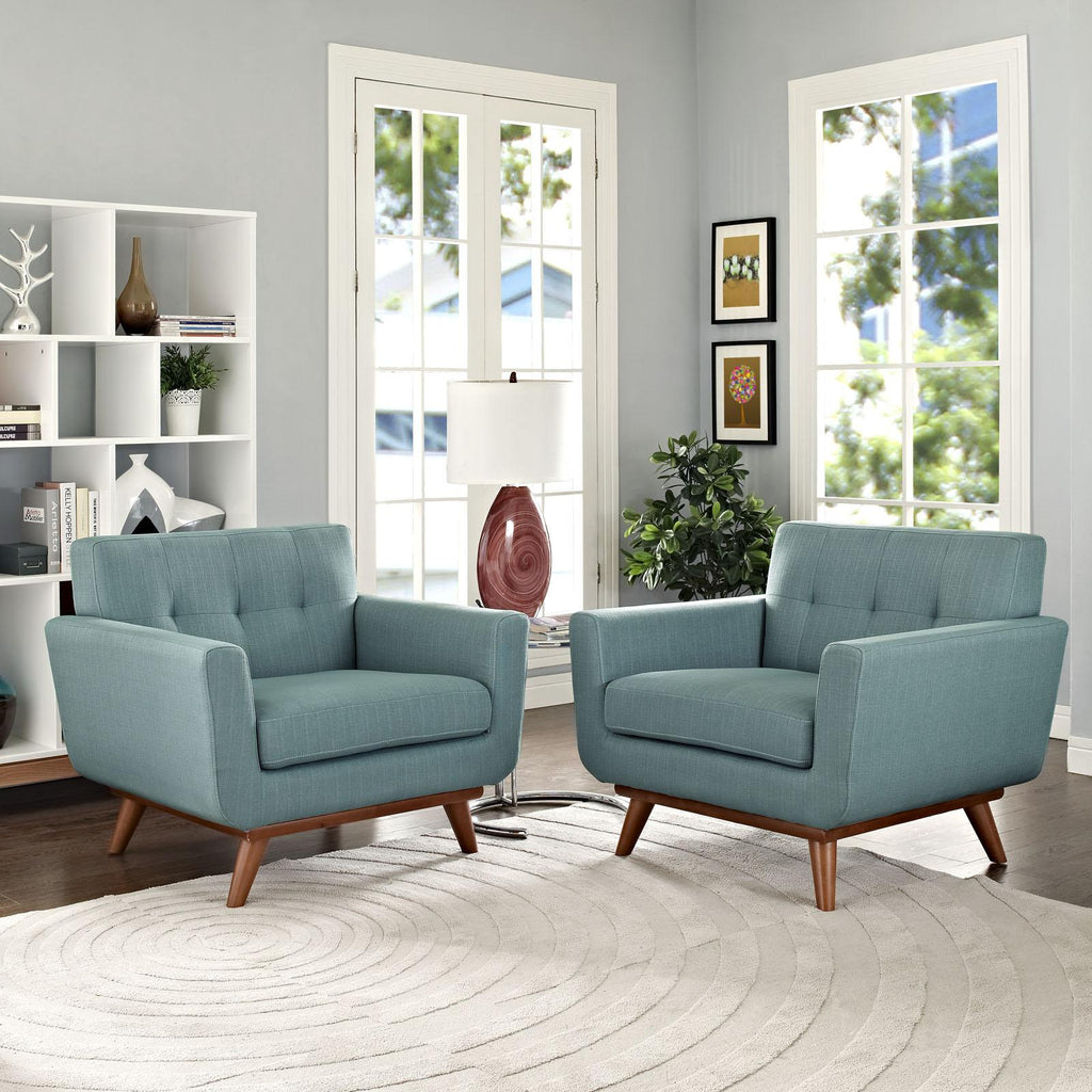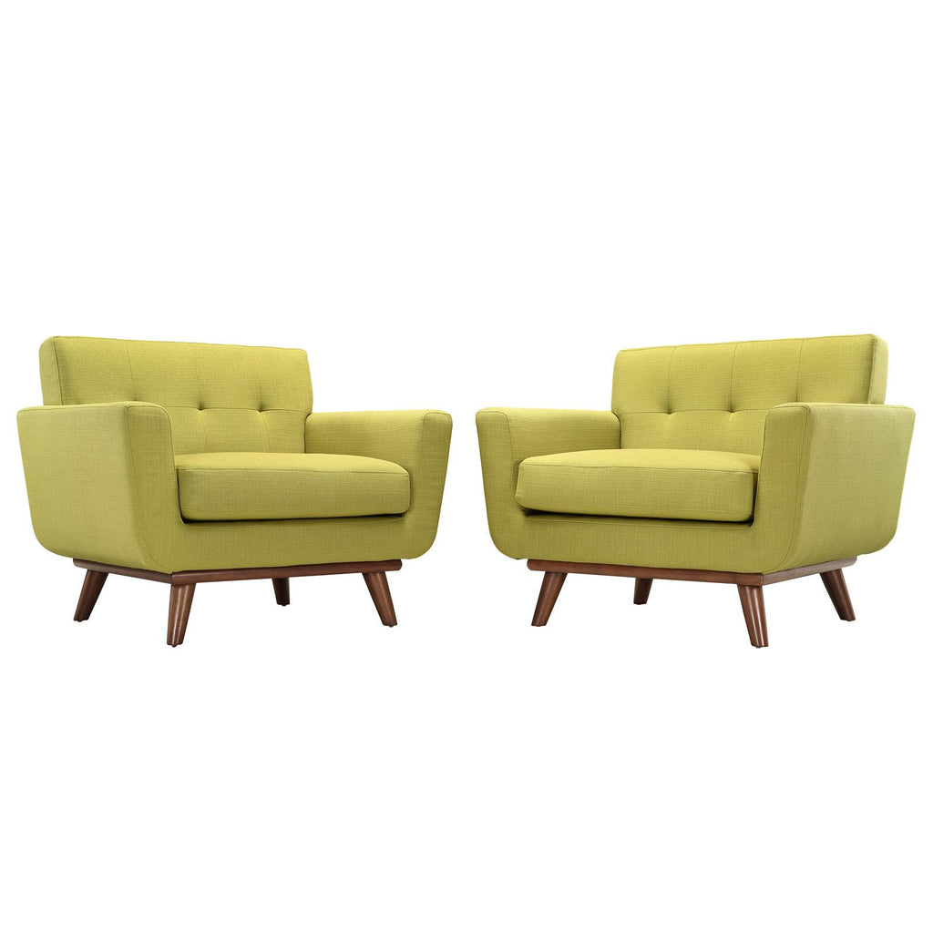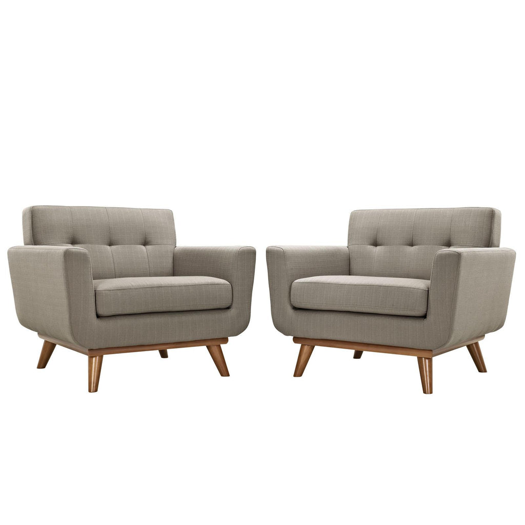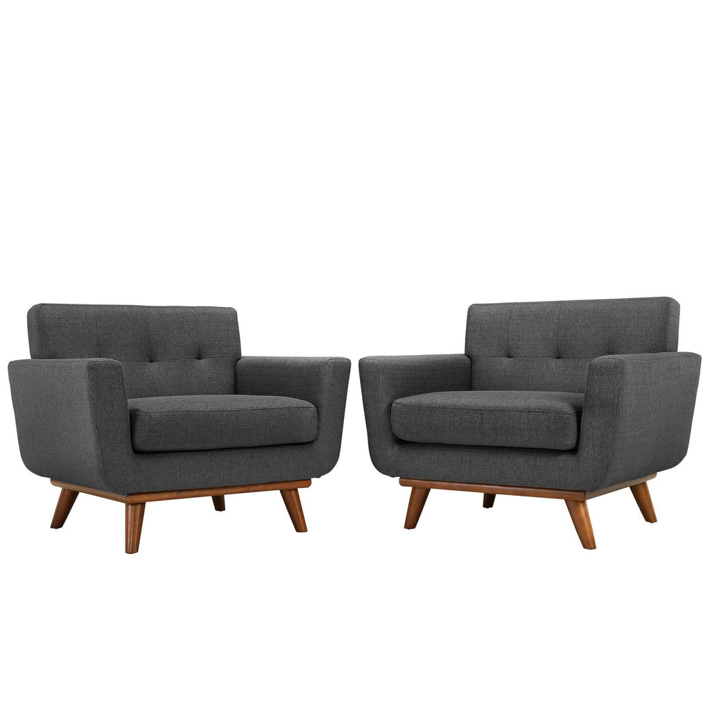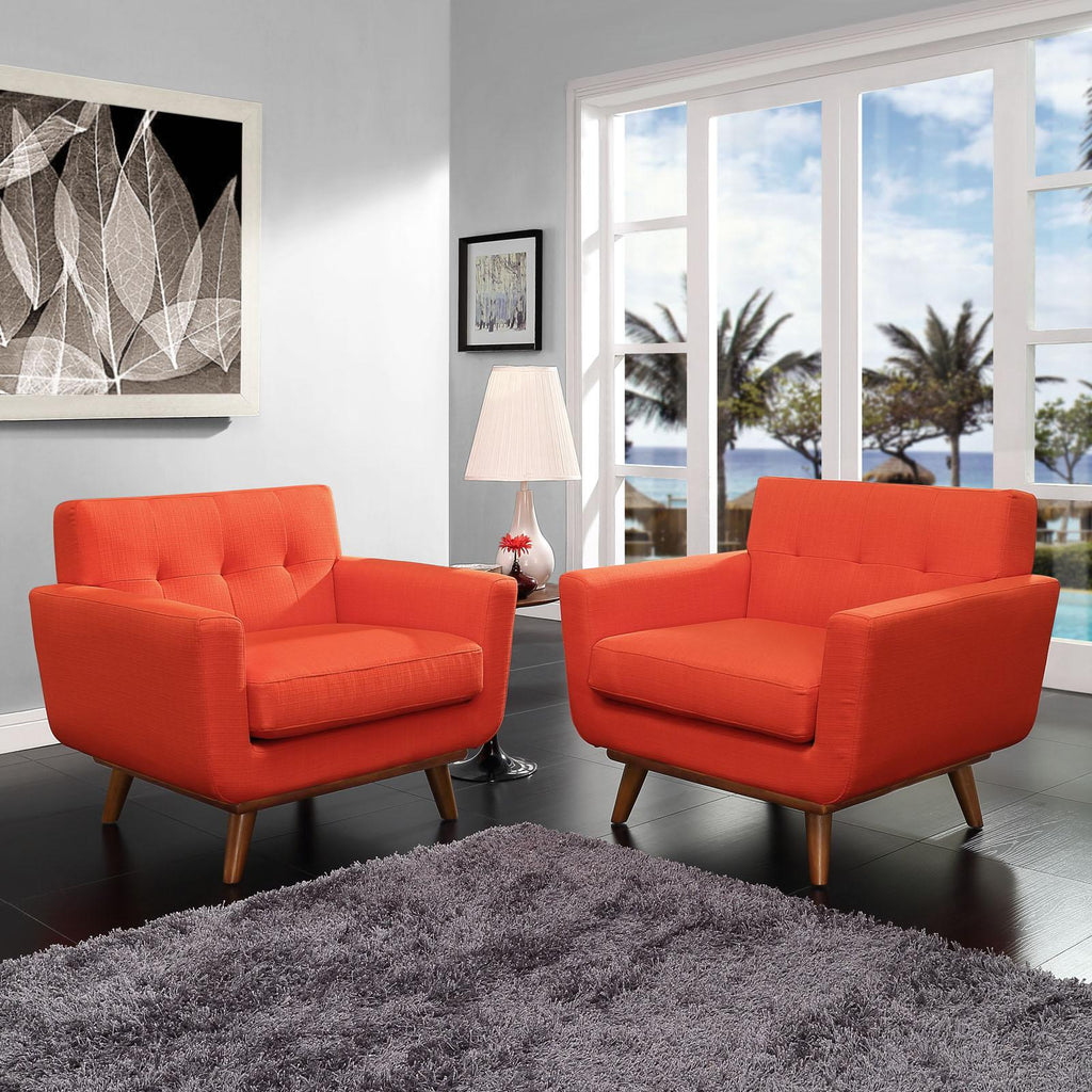 Gently sloping curves and large dual cushions create a favorite lounging spot. Whether plopping down after a long day at work, settling in with coffee and brunch, or entering a spirited discussion with friends, the Engage armchair is a welcome presence in your home. Seven tufted buttons create eye-catching appeal, adding depth that brings your sitting d�cor to center stage. Four cherry color rubberwood legs and frame supply a solid base to the comfortable upholstered material.