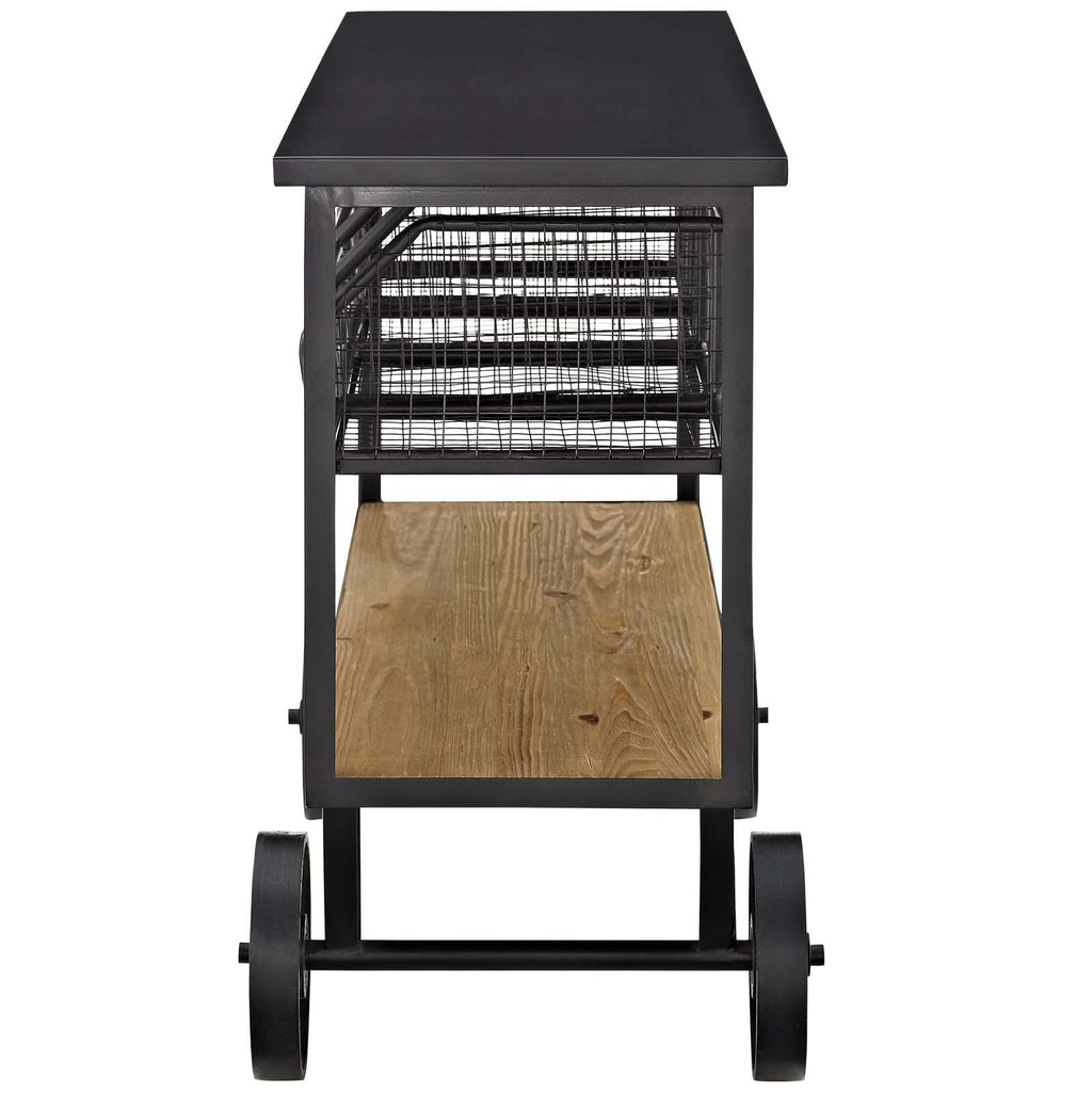 Organize your produce, dishes, and serving items with the Fairground Serving Stand. Reminiscent of old-time fairs and merchant stands, Fairground features a black lacquered steel frame with four removable produce storage baskets and a solid pine wood storage shelf. Positioned on four left-right mobile steel wheels, Fairground is a stand ready to serve up breakfast or lunch with nostalgic farmhouse charm. Each bin is 14� L x 10� W x 8� H.