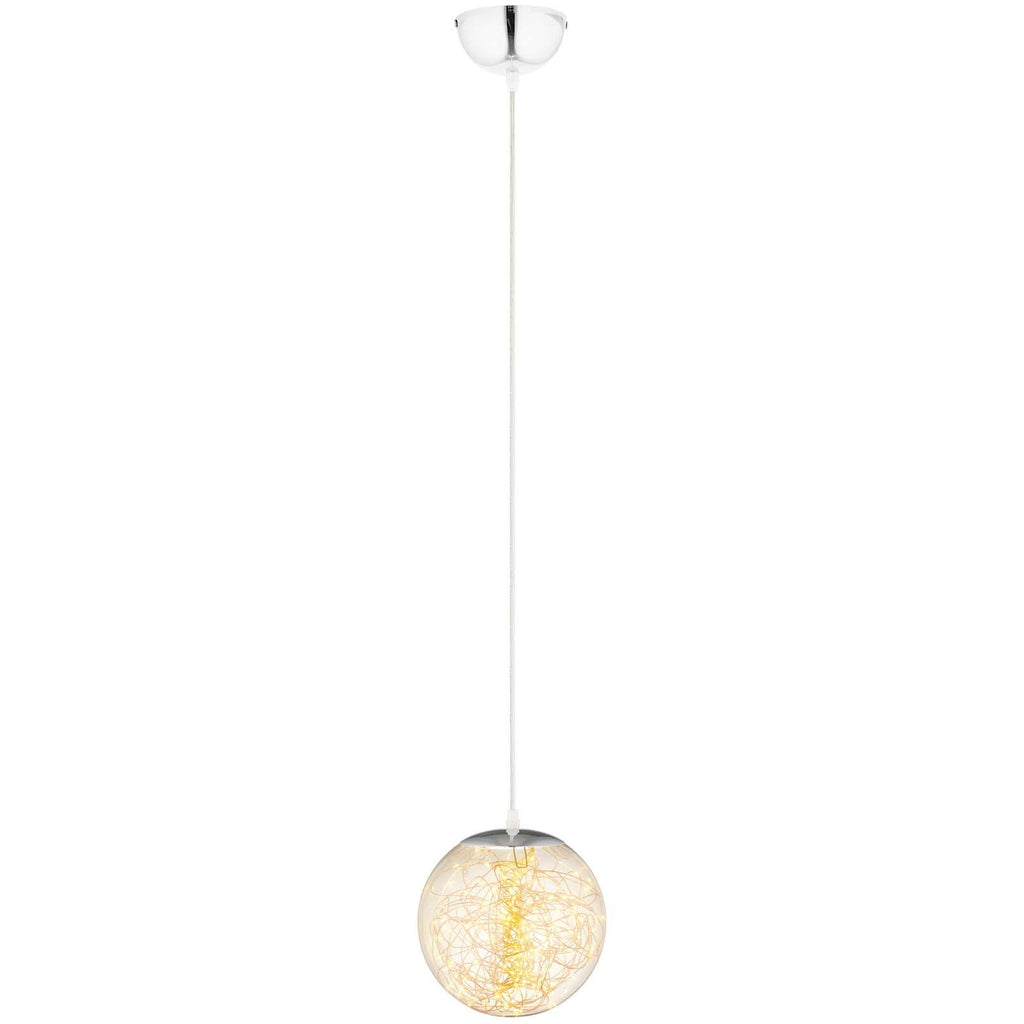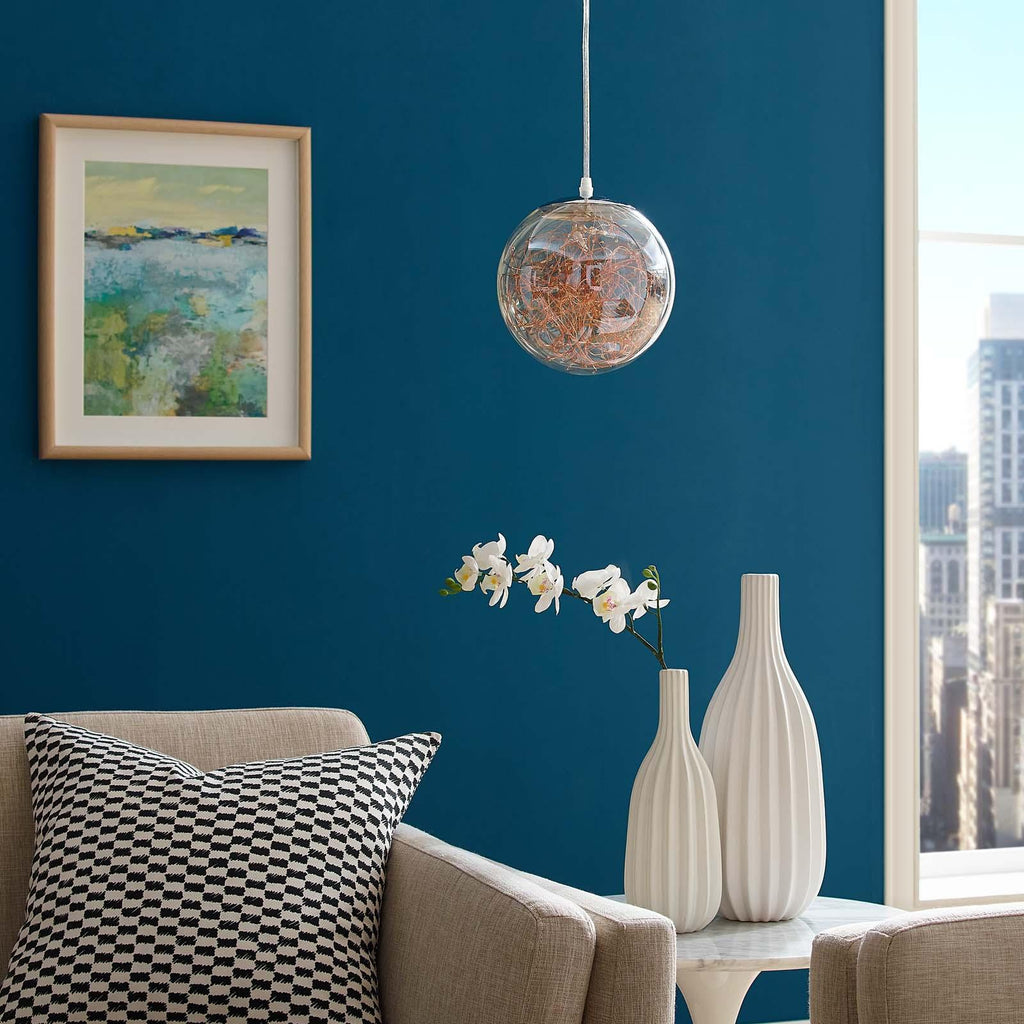 Introduce whimsical flair to your living space with the Fairy 12" Amber Glass Globe Ceiling Light Pendant Chandelier. A modern masterpiece, Fairy features an amber glass globe shade that hangs suspended from a sleek chrome-plated metal canopy and rod with flush wall mount. Transparent wire with 6W LED lights entangled inside the glass orb lights up your surroundings with a golden, sparkling glow. This stunning orb pendant light enhances the living room, dining room, entryway, kitchen, or bedroom and lets your personal style shine through.