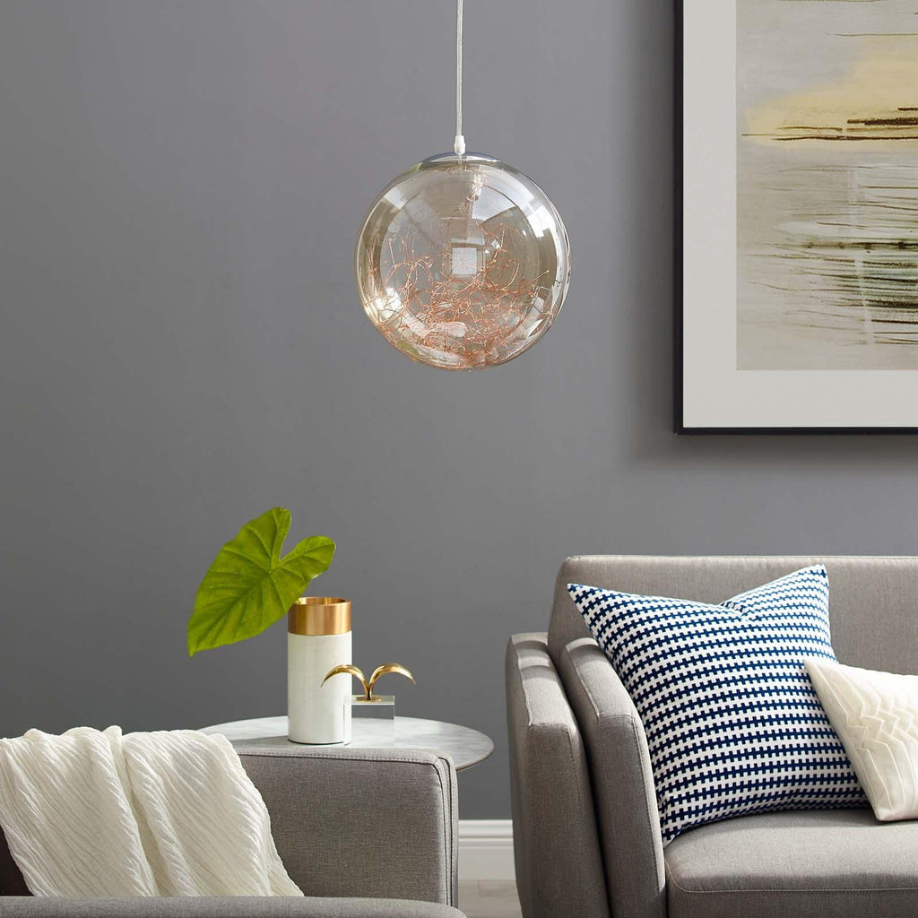 Introduce whimsical flair to your living space with the Fairy 8" Amber Glass Globe Ceiling Light Pendant Chandelier. A modern masterpiece, Fairy features an amber glass globe shade that hangs suspended from a sleek chrome-plated metal canopy and rod with flush wall mount. Transparent wire with 6W LED lights entangled inside the glass orb lights up your surroundings with a golden, sparkling glow. This stunryway, kitchen, or bedroom and lets your personal style shine through.