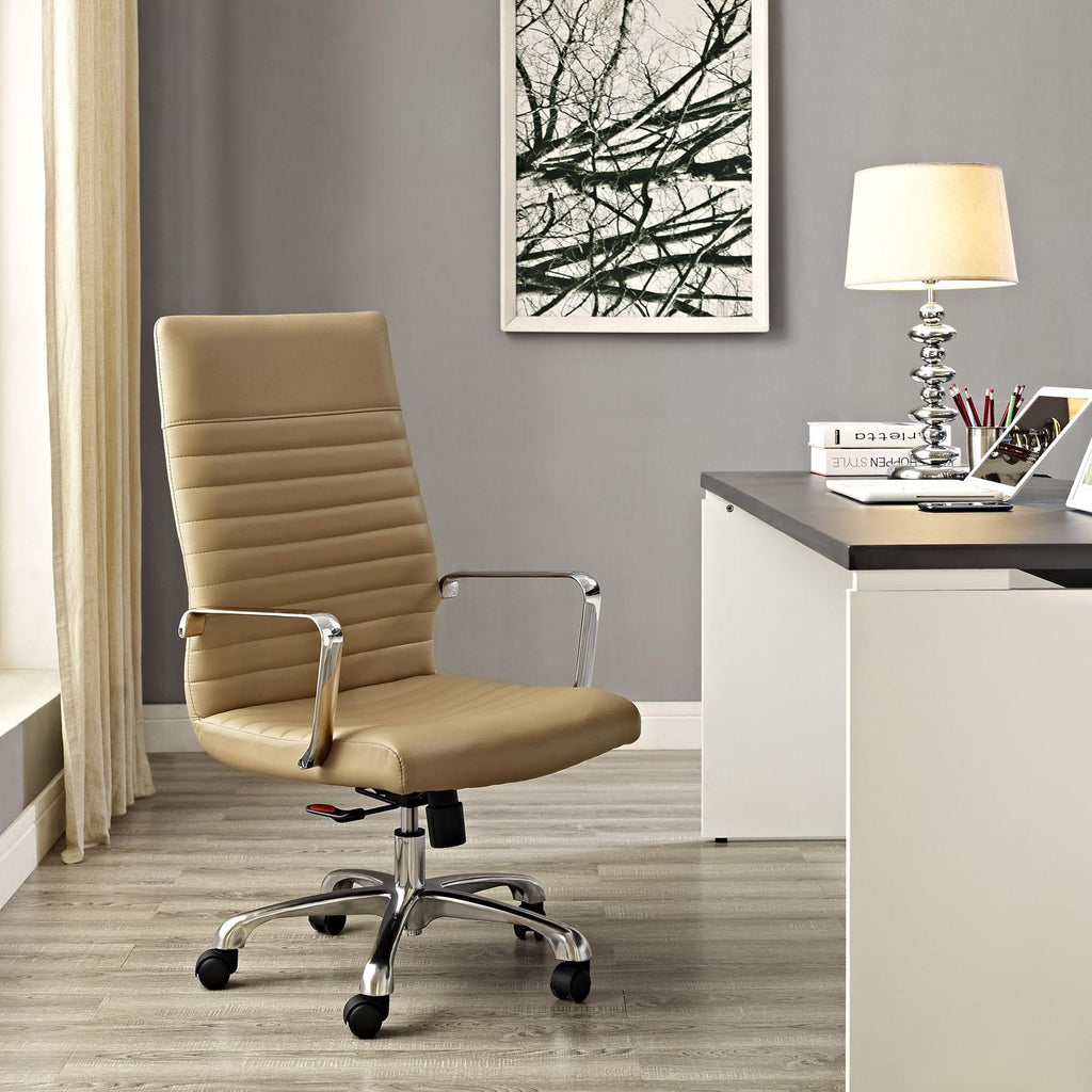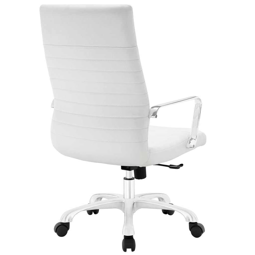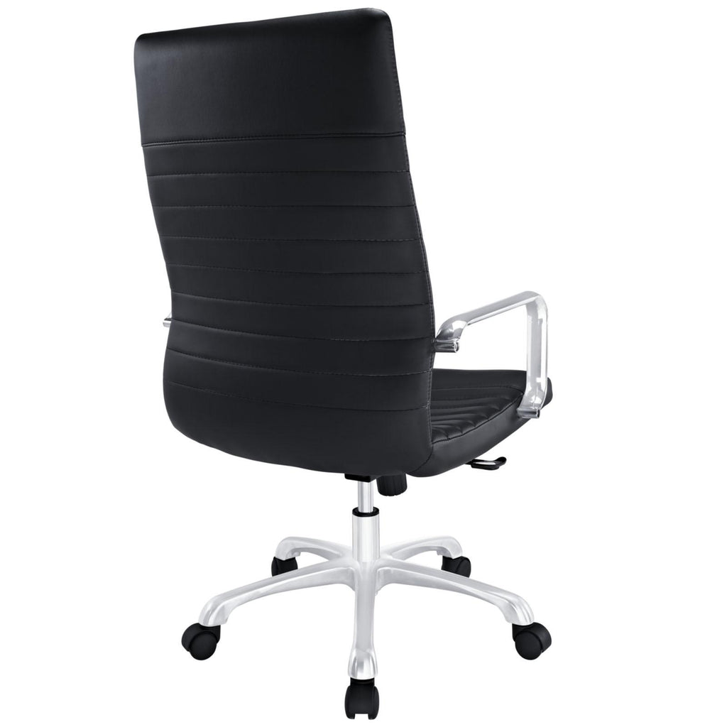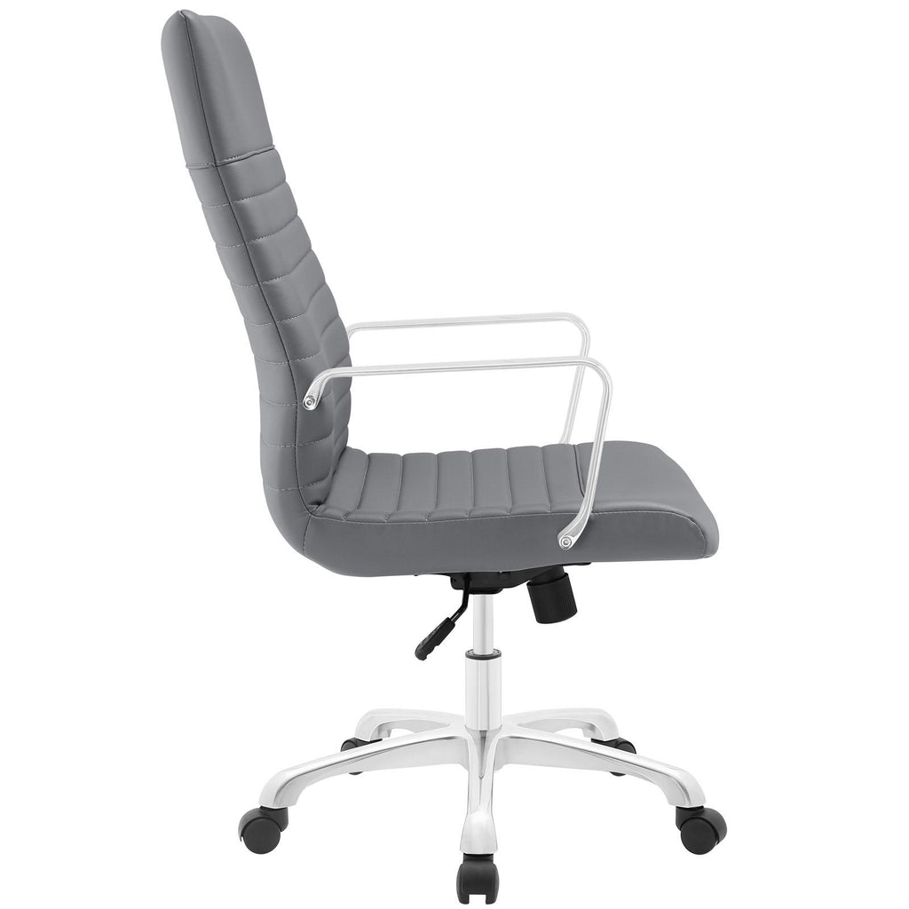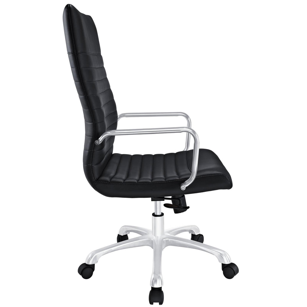 Sweet precision and simple details go into making Finesse Computer Desk Office Chair a pleasantly rewarding office chair. Designed with a delicately ribbed vinyl cushioned high back and waterfall seat, Finesse is a task chair that delivers a touch of everything that matters. Equipped with polished aluminum arms, and a hooded nylon base with five dual-wheeled black casters, easily glide over carpeted surfaces in style. Finesse Home Office Chair also comes with a height adjustable pneumatic lever and tension knob to control the chair�s backward tilt. Set Includes: One - Finesse Highback Chair Modern office chair Ribbed vinyl design Five dual-wheeled casters Polished aluminum arms Padded high back 360-degree swivel Assembly Required Weight Capacity: 330 Pounds Overall Product Dimensions: 23.5"L x 25.5"W x 43 - 46.5"H Seat Dimensions: 19"L x 21"W x 15 - 17"H Armrest Dimensions: 23.5"L x 0.5"W x 25 - 28.5"H Backrest Dimensions: 18.5"L x 5"W x 24"H Base Dimensions: 12.5"L x 12.5"W Space Setween Armrest and Seat: 4.5"H Cushion Thichkness: 2.5"H