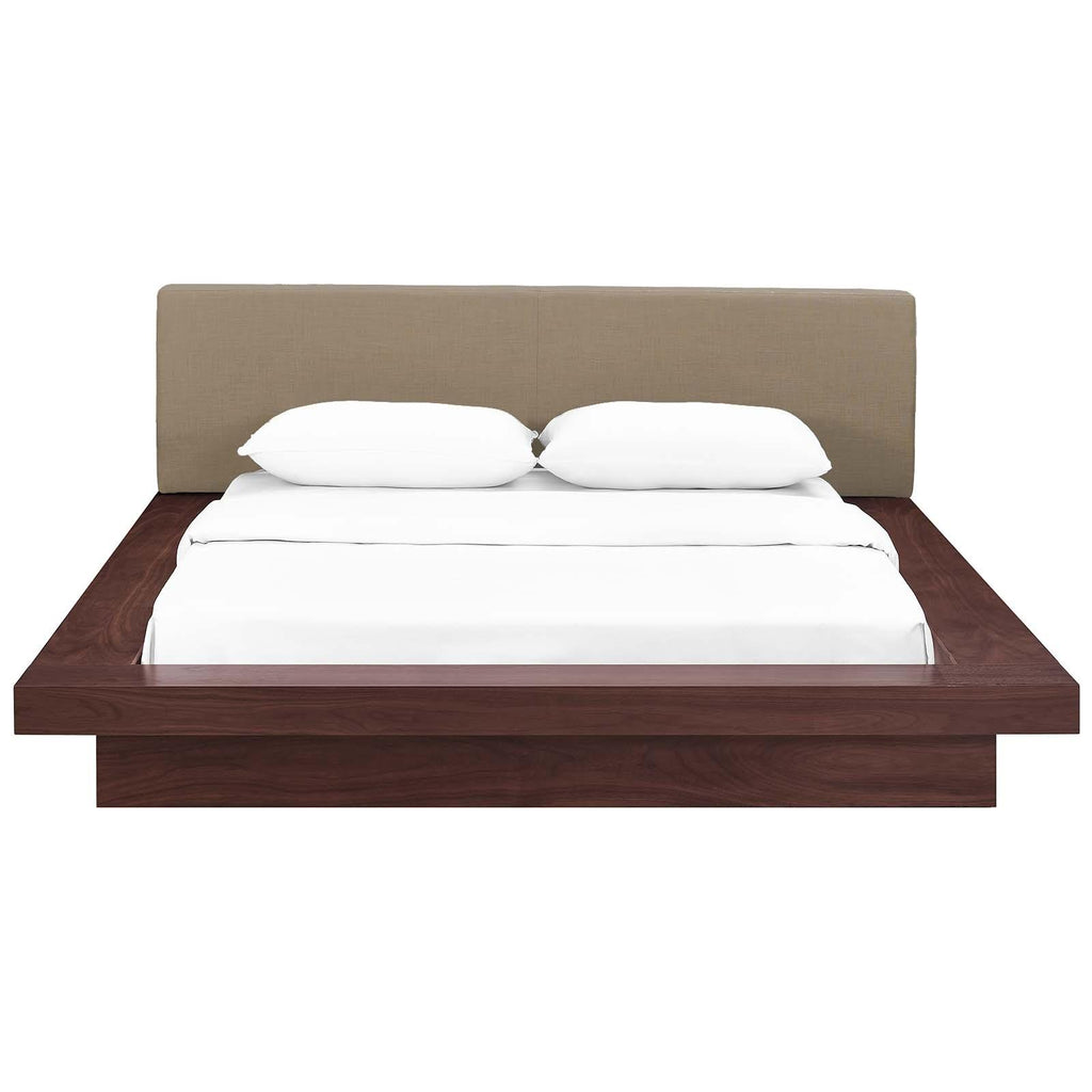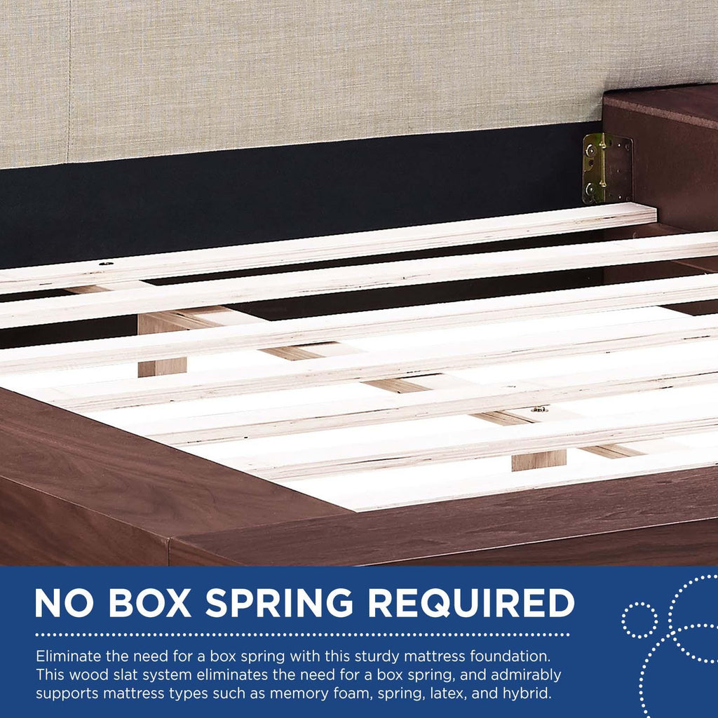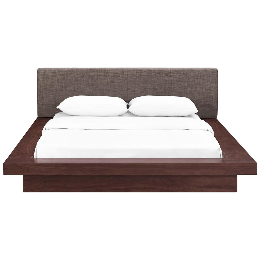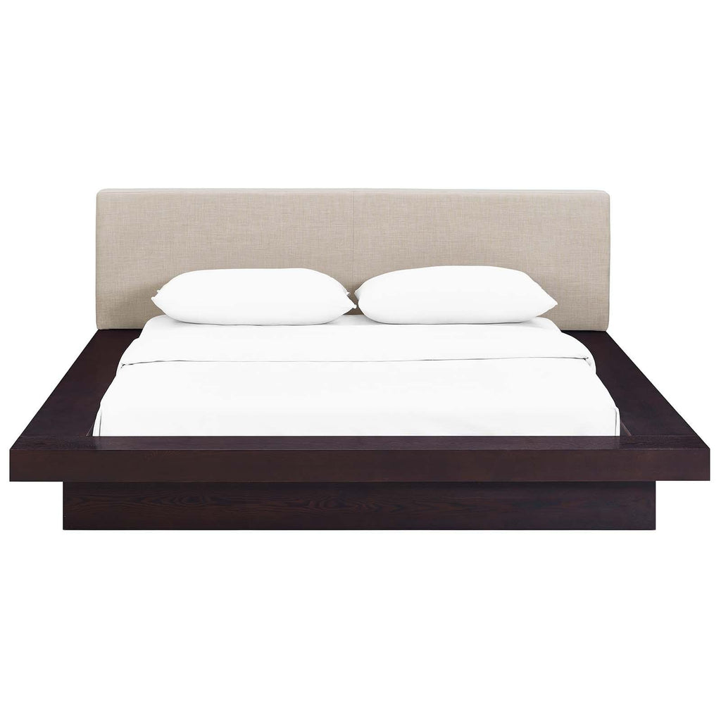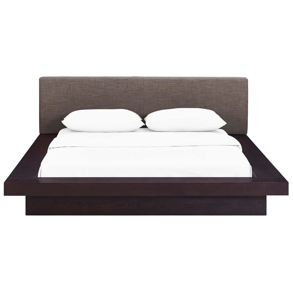 Instantly transform your bedroom landscape with the Freja Platform Bed. Designed with clean straight lines and a compelling aesthetic, Freja features a sturdy laminated particleboard base with cappuccino veneer, foam-padded headboard upholstered in polyester fabric, slatted support that eliminates the need for a box spring, and a reinforced center beam with supporting legs for maximal stability. Update your bedroom d�cor with an engaging platform bed which evinces a refined look and striking design. Freja admirably supports mattress types such as memory foam, spring, latex, and hybrid. Mattress Not Included.