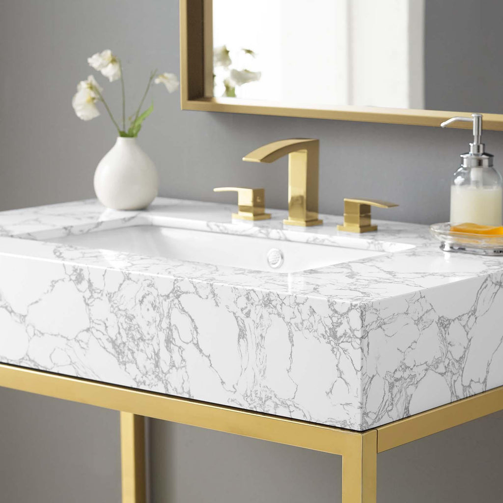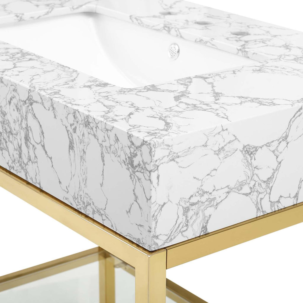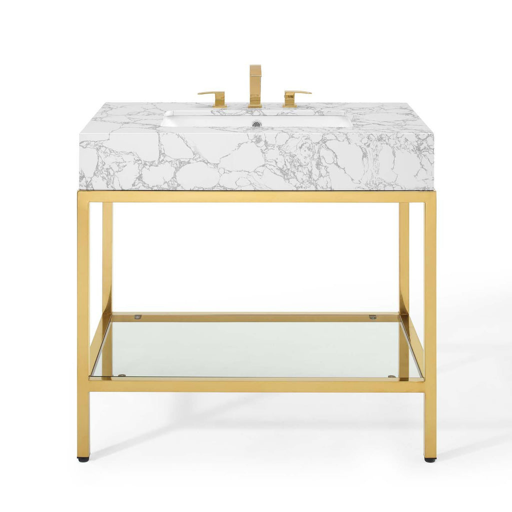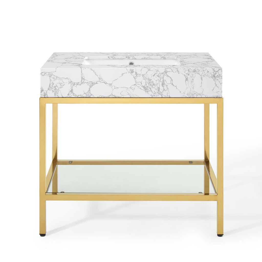 Channel opulence with the glam deco Kingsley Brushed Gold Stainless Steel Artificial Marble Bathroom Vanity. The Kingsley Bathroom Vanity introduces a royal style to your bathroom with the artificial marble curved basin and gold metal accents. Resting on a brushed gold stainless steel frame, the Kingsley 8-Inch Centerset Bathroom Vanity features a modern glass shelf for storing all your bathroom essentials and rests on non-marking foot caps to protect flooring. Assembly required, fixtures not included.