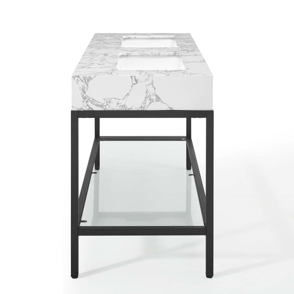 Channel opulence with the glam deco Kingsley Matte Black Stainless Steel Artificial Marble Bathroom Vanity. The Kingsley Bathroom Vanity introduces a royal style to your bathroom with the dual artificial marble curved basins and matte black metal accents. Resting on a black stainless steel frame, the Kingsley 8-Inch Centerset Bathroom Vanity features a modern glass shelf for storing all your bathroom essentials and rests on non-marking foot caps to protect flooring. Assembly required, fixtures not included. Set Includes: One - Kingsley 60" Black Stainless Steel Bathroom Vanity Glam Deco Bathroom Vanity Artificial Marble Basin Matte Black Stainless Steel Frame Non-Marking Foot Caps Glass Storage Shelf Assembly Required 8" Centerset. Fixtures Not Included Overall Product Dimensions: 23"L x 60"W x 34"H Top Dimension: 23"L x 60"W x 6"H Base Dimension: 23"L x 60"W x 28"H