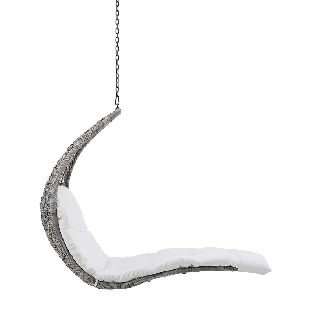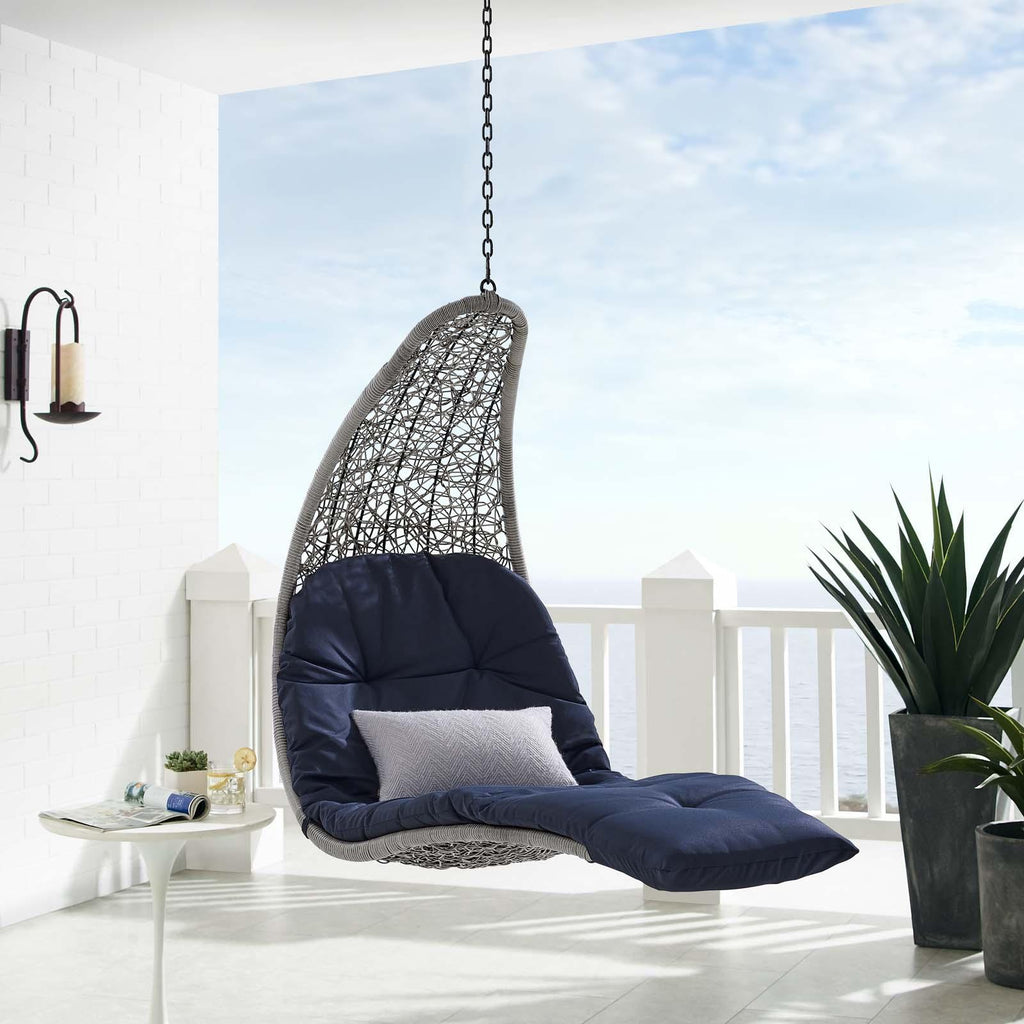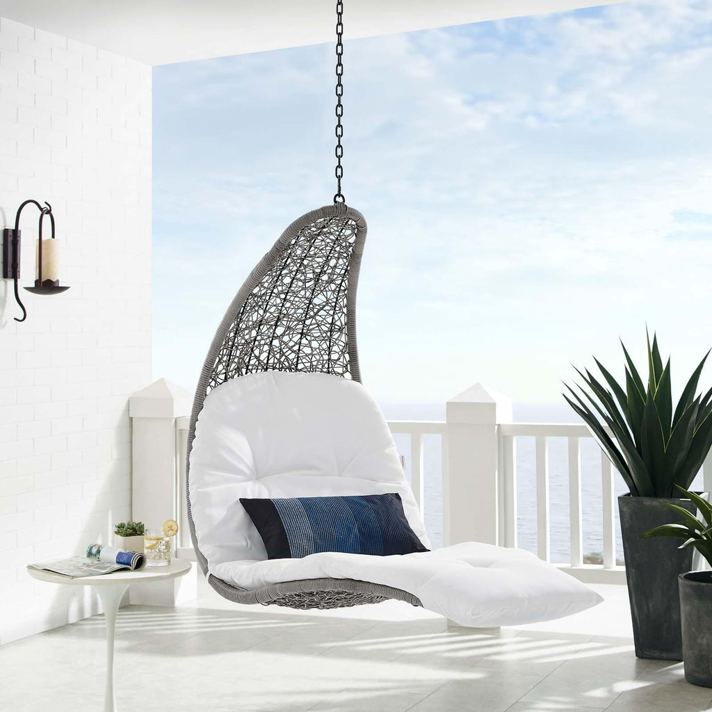 Escape to a place of relaxation with the Landscape Outdoor Patio Hanging Chaise Lounge Swing Chair. Wrapped with a textured synthetic rattan light gray and tan weave, this outdoor chaise lounger features a plush padded cushion upholstered in all-weather polyester fabric for lasting comfort. With a sturdy metal hanging chain, Landscape's organic design and sleek profile bring contemporary style to your outdoor patio, backyard, porch, or poolside. Sit back and relax with your feet up while enjoying warm weather and the calming movement of this outdoor porch swing. Hanging Weight Capacity: 264 lbs.