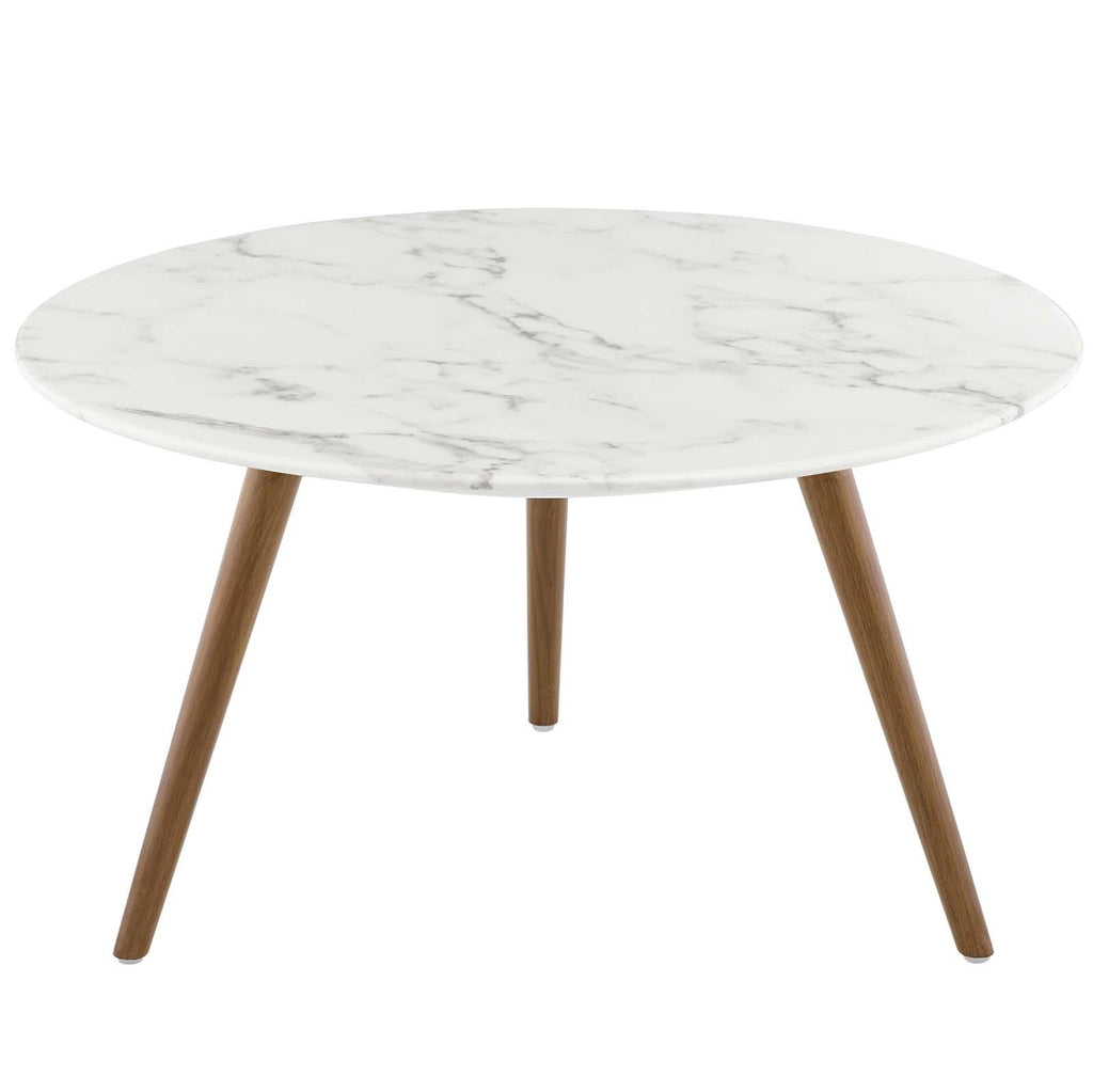 Reflecting a seamless organic shape and timeless form, the Lippa Table has become a symbol of modernism for over the past 60 years. Before its release, homes were filled with clunky remnants of an industrial age long gone by. But in order to advance into the new world, homes first had to transition from the traditional square table, into a piece that connoted progress. A twist on the original design, this coffee table features a round walnut veneer MDF table top lacquered with a scratch-resistant finish and tripod base with tapered walnut stained dowel legs. This rendition of Lippa is a coffee table that's perfect for the living room, lounge area, or home office. Set Includes: One - Lippa 28" Round Coffee Table with Tripod Base Mid-Century Modern Coffee Table 28" Round White Lacquered MDF Top Tripod Base Tapered Walnut Stained Wood Legs Chip and Scratch Resistant Finish Overall Product Dimensions: 27.5"L x 27.5"W x 14.5"H Floor to underside of table: 13"H Table Top Thickness: 1.5"H