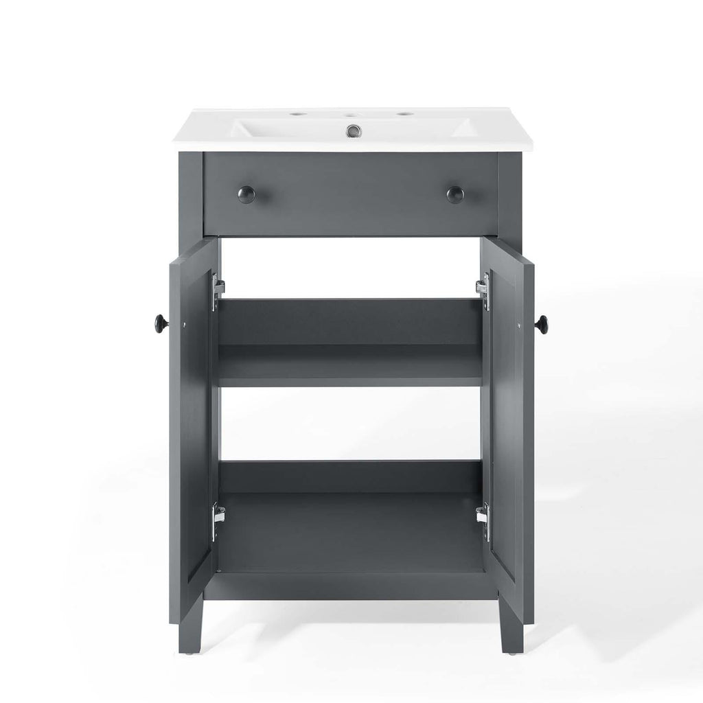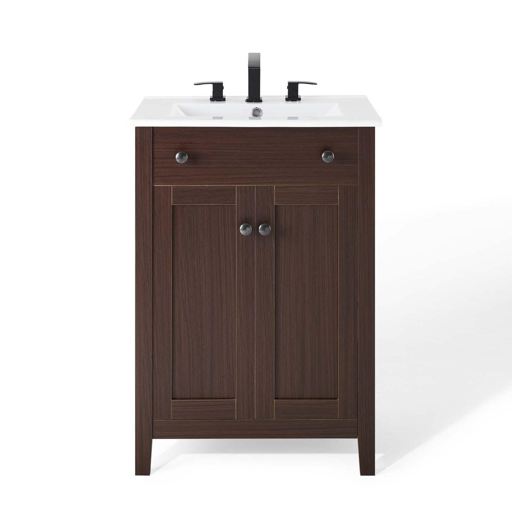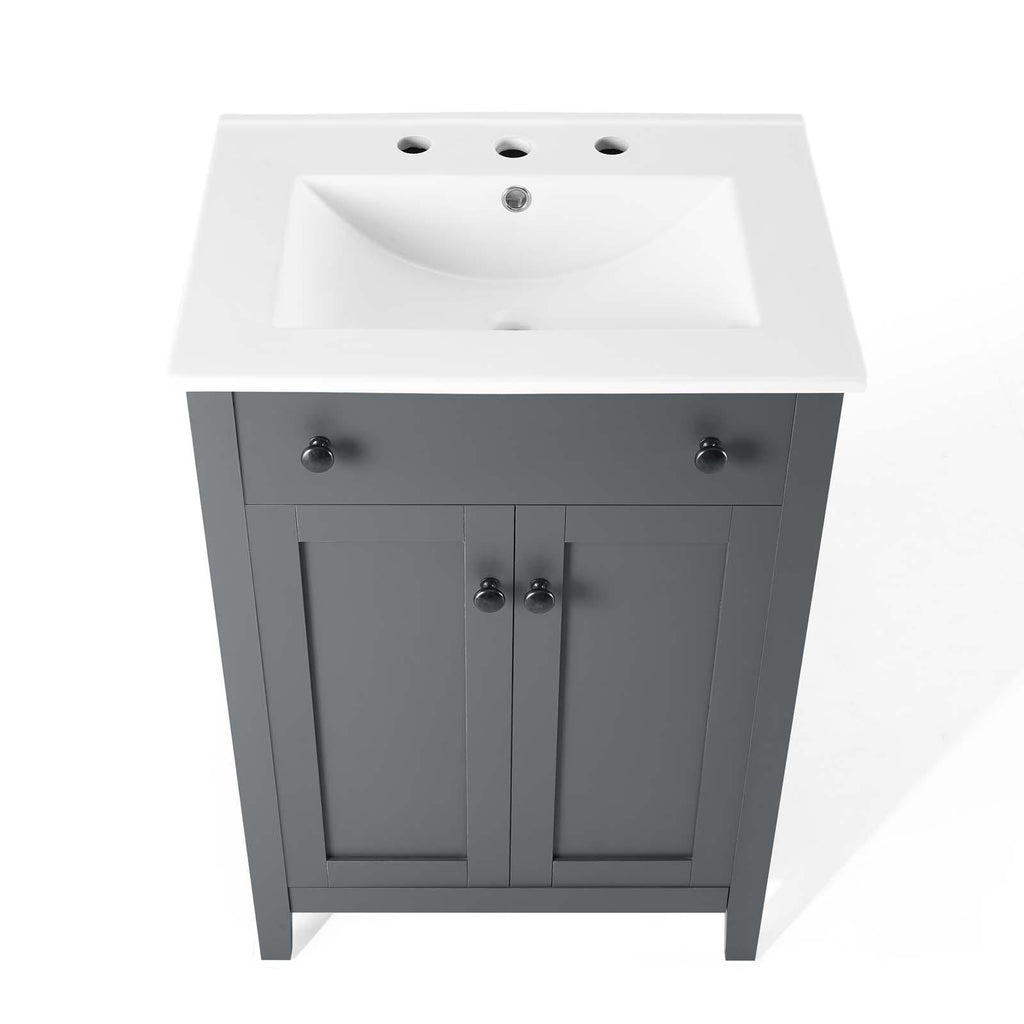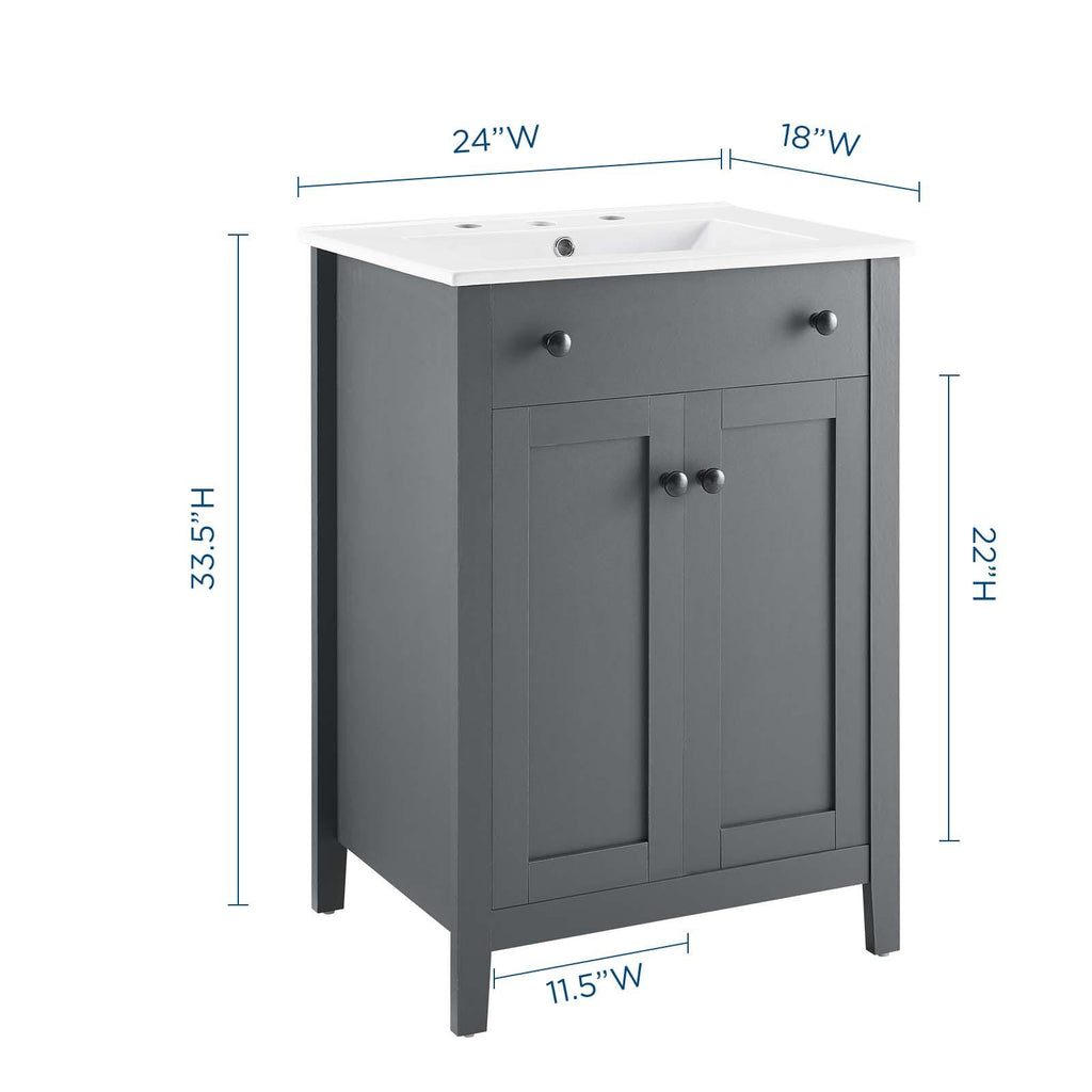 Embrace the subtle sleekness of the Nantucket Bathroom Vanity. Nantucket features crisp lines and a stately design that seamlessly updates your bathroom decor. Solidly constructed from wood and MDF particleboard, the Nantucket Vanity sits on four tapered legs and provides hidden dual storage shelves with soft-close doors. Featuring a curved basin and 8-inch centerset faucet holes, the Nantucket Bathroom Vanity aligns style with function for a modern bathroom. Nantucket comes with non-marking foot caps to protect flooring. Assembly required, fixtures not included. Set Includes: One - Nantucket 24" Bathroom Vanity Modern Bathroom Vanity Soft-Close Doors Non-Marking Foot Caps 8" Centerset Faucet Holes Integrated Ceramic Top Assembly Required Overall Product Dimensions: 18"L x 24"W x 33"H