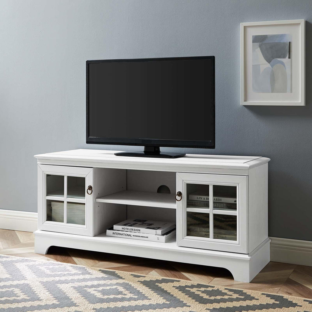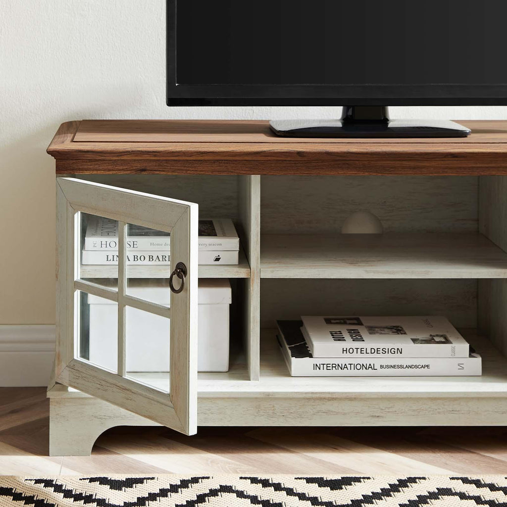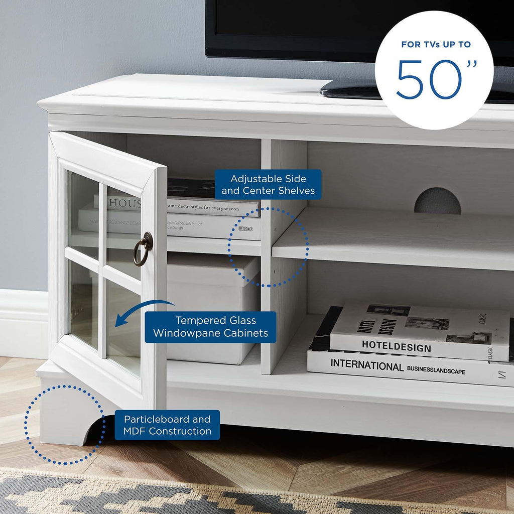 Reinvent your living space with the Pacific 47" TV Stand. Made with durable particleboard and MDF, Pacific's coastal contemporary design features dual windowpane cabinets with adjustable shelves and a large open center area for storage of media essentials. Keeping visual space clean, Pacific is complete with cable management and an adjustable center shelf to suit your media storage needs. This accent piece blends contemporary style with a coastal vibe perfect for the modern home. Accommodates flat screen TVs up to 50".