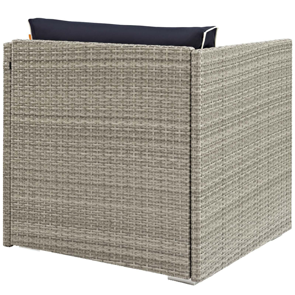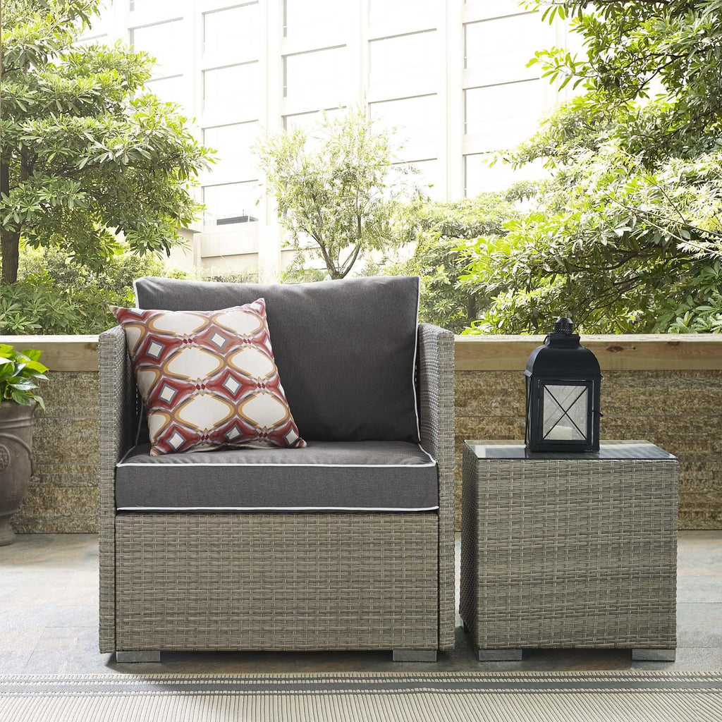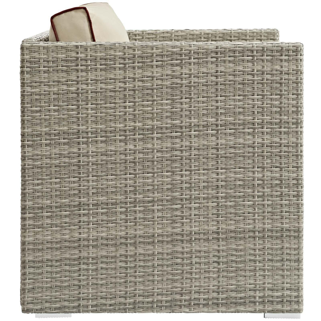 Enjoy the outdoors while benefiting from style and comfort of the Repose Outdoor Patio Furniture Series. Repose Patio Arm Chair offers a detailed tan and gray synthetic rattan weave with UV protection for eye-catching appeal and durability, plush 4� thick all-weather polyester cushions with contrasting color French piping, non-marking foot pads, and a sturdy powder-coated aluminum frame that supports up to 331 pounds. Subtle style defines the Repose outdoor sectional collection making it a natural choice for enhancing your patio, backyard, or poolside gatherings. This installment of the series is an outdoor patio arm chair.