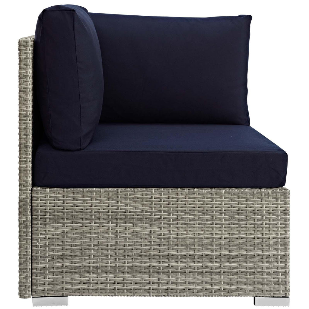 Enjoy the outdoors while benefiting from style and comfort of the Repose Outdoor Patio Furniture Series. Repose Patio Corner Sofa Chair offers a detailed tan and gray synthetic rattan weave with UV protection for eye-catching appeal and durability, plush 4� thick all-weather polyester cushions using industry-leading Sunbrella� fabric, non-marking foot pads, and a sturdy powder-coated aluminum frame that supports up to 331 pounds. Subtle style defines the Repose outdoor sectional collection making it a natural choice for enhancing your patio, backyard, or poolside gatherings. This installment of the series is a patio corner sofa chair.