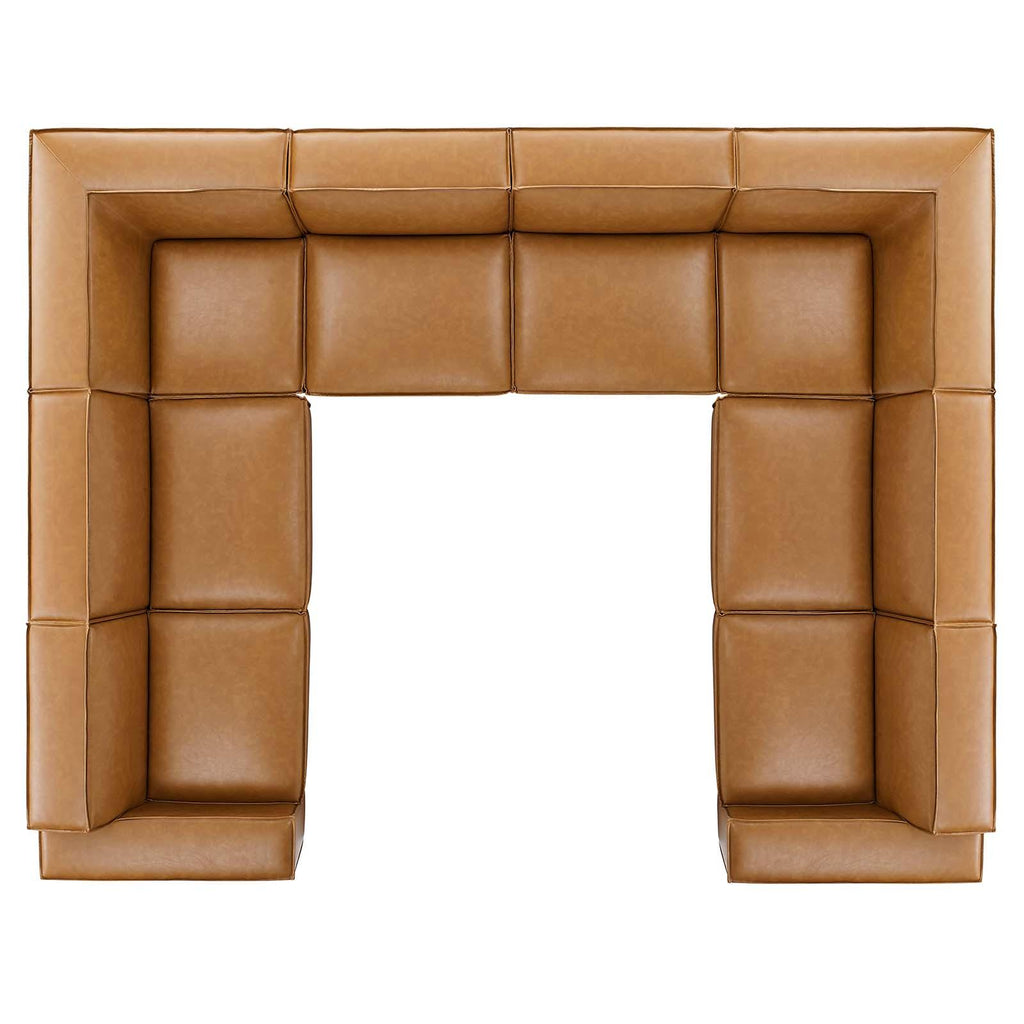 Create your custom living room and lounge area with the Restore Vegan Leather 8-Piece Sectional Sofa. The Restore Sectional Sofa appeals to minimalist elegance with a crisp design and broad lines accented with French piping details and vegan leather upholstery. Dense foam padding and a pocket coil spring system in the cushions offer a luxe seating experience for your living room and lounge. The Restore Living Room Sectional Sofa is solidly constructed from plywood and wood with non-marking foot caps to protect flooring and connectors between modular pieces. Each Piece Weight Capacity: 440 lbs.