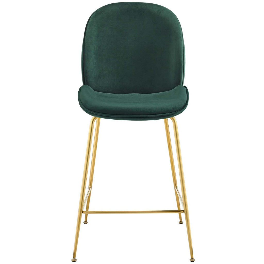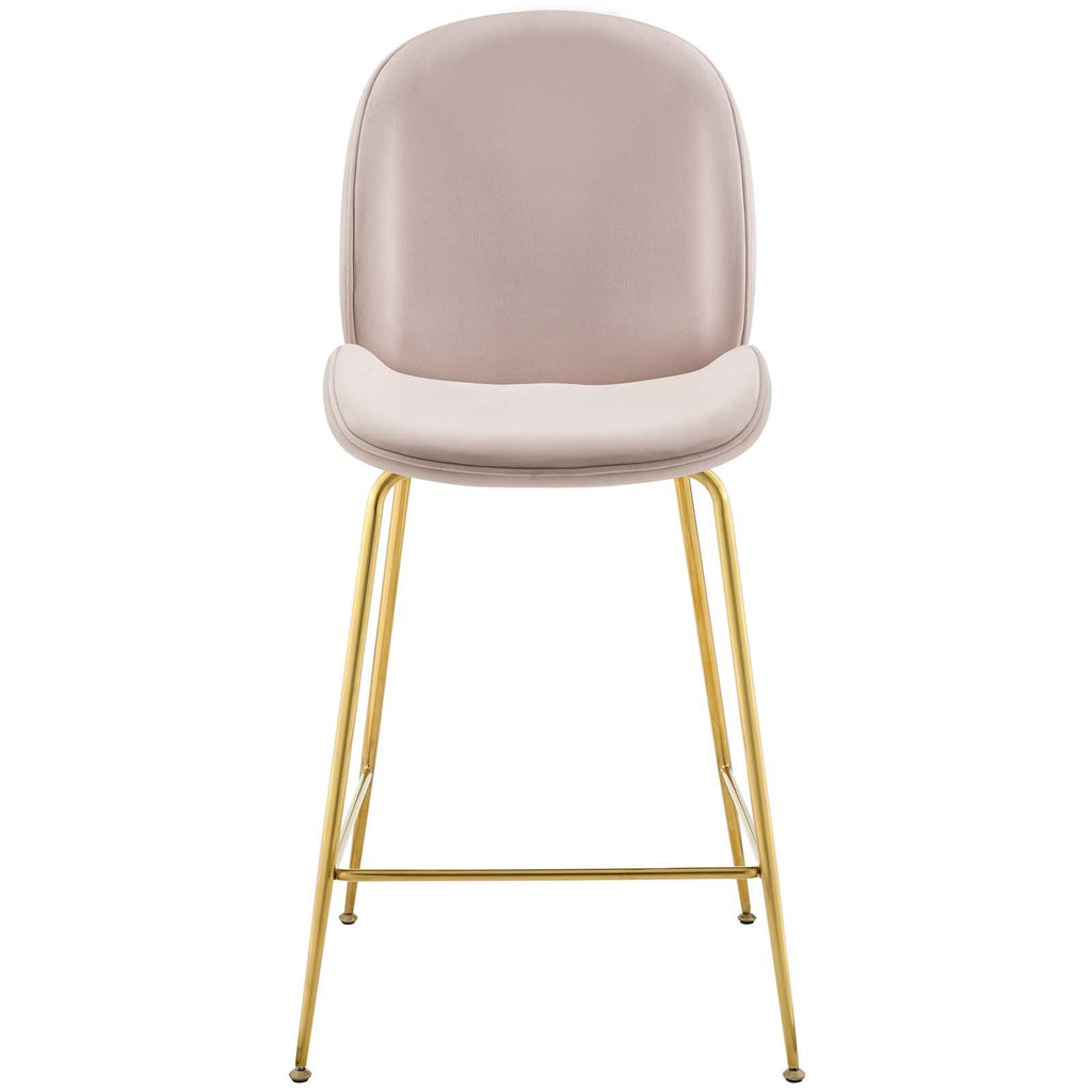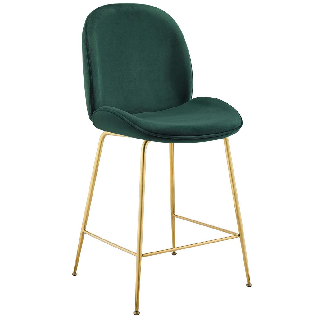 Breeze into vintage glamour decor with the whimsical Scoop counter stool. Supported by a splayed gold stainless steel frame, Scoop comes with a soft, stain-resistant performance velvet polyester upholstery for a unique addition to your counter decor. Padded in dense foam, Scoop features simple curves and a sleek, minimalist frame that combine to deliver a modern counter stool perfect for all your counter height needs. Complete with a footrest and non-marking foot caps, transform your kitchen decor today with this cheerful and elegant counter height stool.