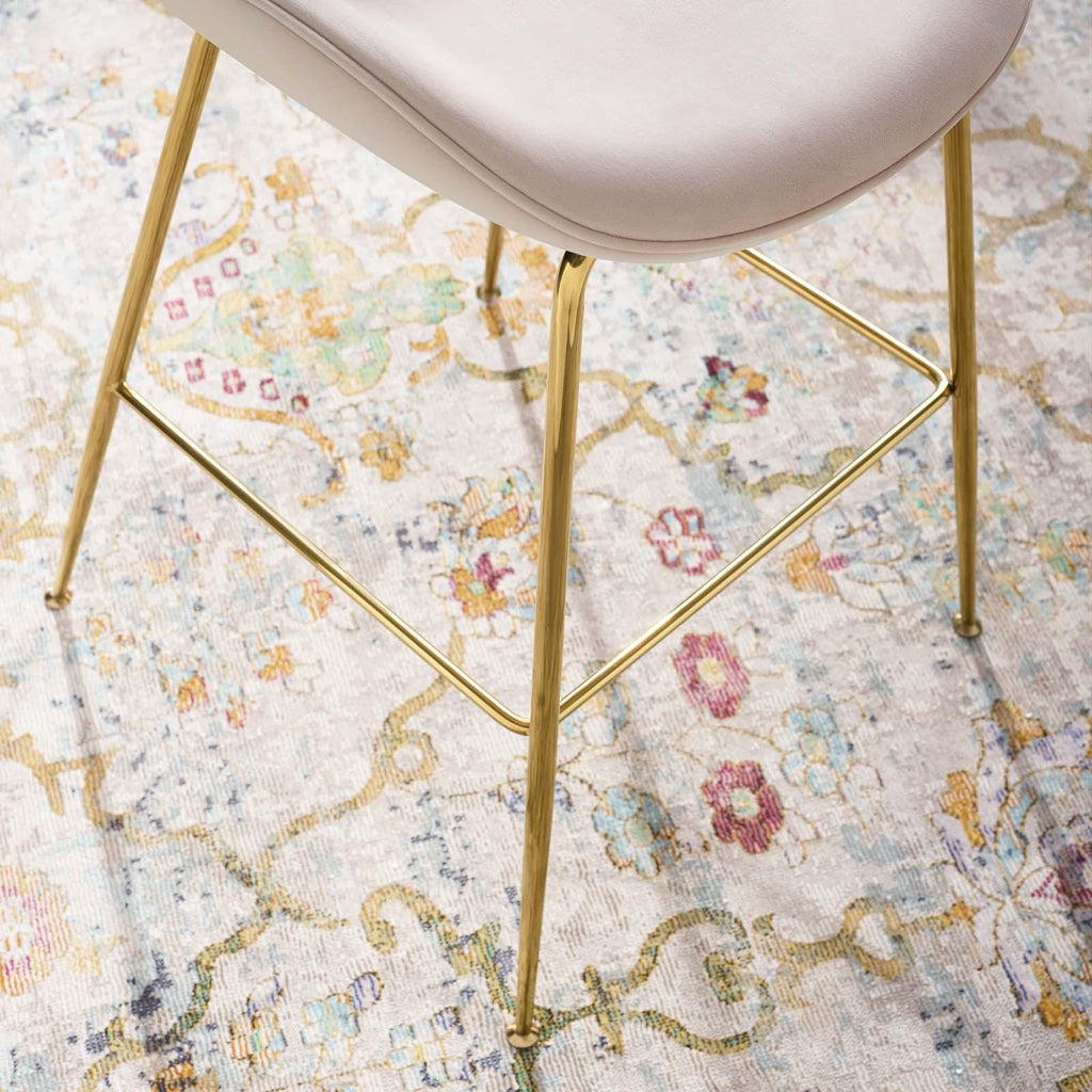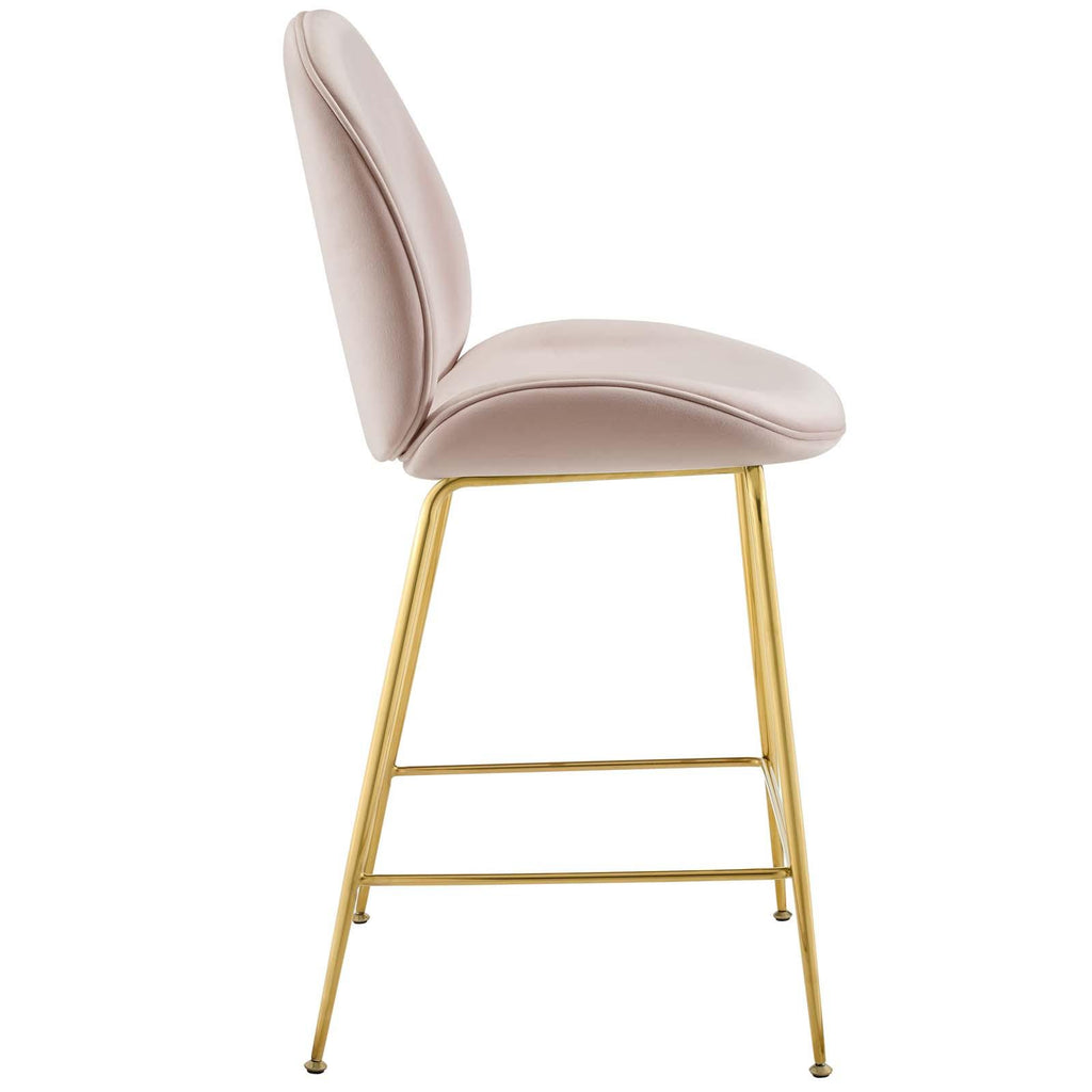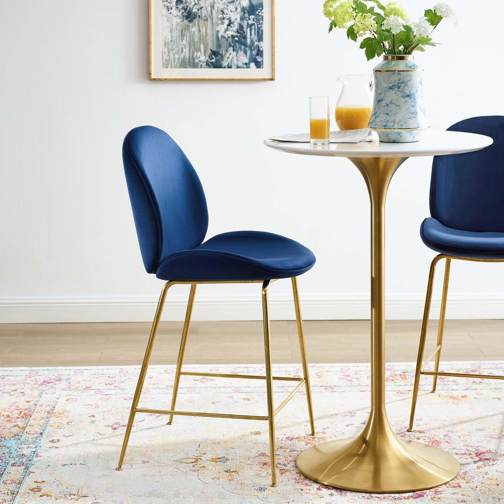 Breeze into vintage glamour decor with the whimsical Scoop counter stool. Supported by a splayed gold stainless steel frame, Scoop comes with a soft, stain-resistant performance velvet polyester upholstery for a unique addition to your counter decor. Padded in dense foam, Scoop features simple curves and a sleek, minimalist frame that combine to deliver a modern counter stool perfect for all your counter height needs. Complete with a footrest and non-marking foot caps, transform your kitchen decor today with this cheerful and elegant counter height stool.