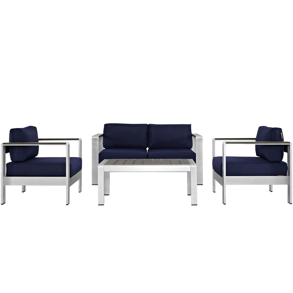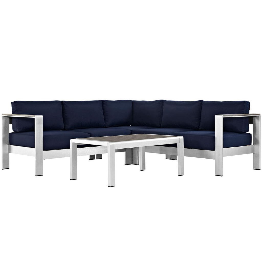 Enjoy your patio or backyard leisure time with the strong and durable Shore Outdoor Patio Collection. Made of anodized brushed aluminum frames and non-marking black plastic foot caps, Shore Outdoor Sectional Sofa pieces come outfitted with resilient fabric canvas tested to last through all weather conditions. The Shore Outdoor Patio Sectional Furniture Set complements casual gatherings with a chic look and ready versatility you can rely on.