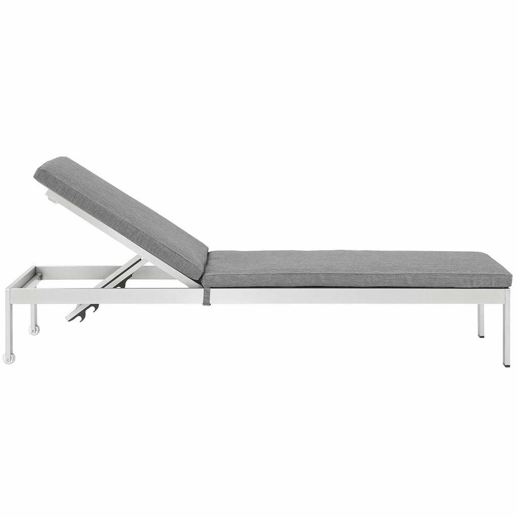 Maintain clean lines with the Shore Outdoor Patio Chaise Lounge Chair Set. Strong and durable, relax as you choose from four available recline positions while relaxing on machine washable all-weather cushions, or sunbathe while lying flush on Shore�s breathable Textilene� mesh. Made with an anodized brushed aluminum frame, Shore Patio Chaise Lounge is a breeze to assemble, comes with clear wheels for easy mobility on the top end, and non-marking black plastic foot caps under the bottom two support legs. Chic and minimalist, the Shore Outdoor Sun Lounger is a piece built to last with the comfort and versatility you�ve been looking for in an outdoor lounger.