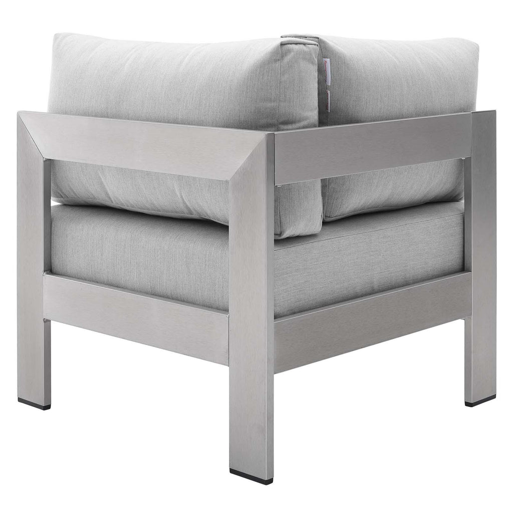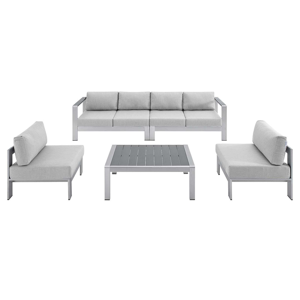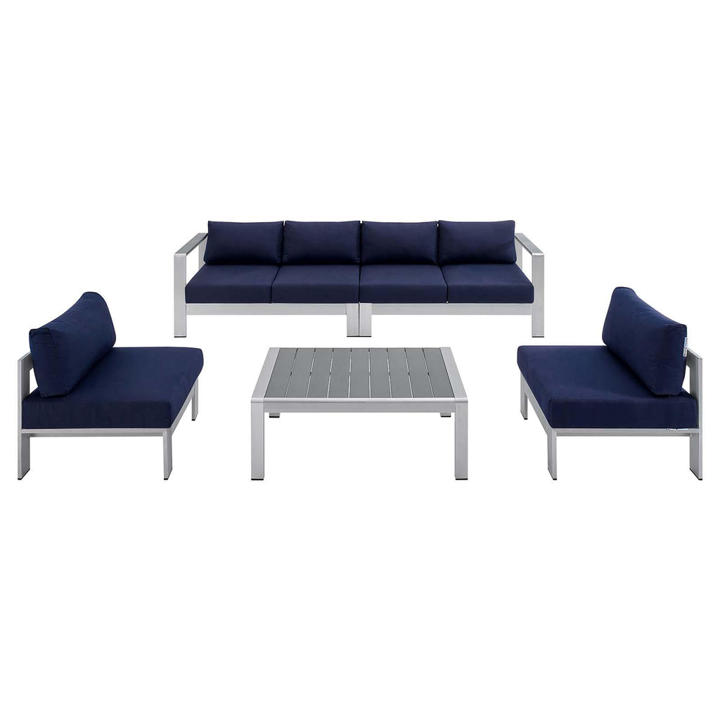 Enjoy your patio or backyard leisure time with the strong and durable Shore Outdoor Patio Aluminum 5 Piece Sectional Sofa Set. Made with anodized brushed aluminum frames and non-marking black plastic foot caps, Shore comes outfitted with resilient Sunbrella� fabric canvas cushions tested to last through all weather conditions. The Shore Outdoor Sectional Sofa Set complements your casual gatherings with a look and functionality you can rely on. Set Includes: 1 Left-Arm Sofa, 1 Right-Arm Sofa, 1 Corner Chair, 1 Armchair, 1 Coffee Table
