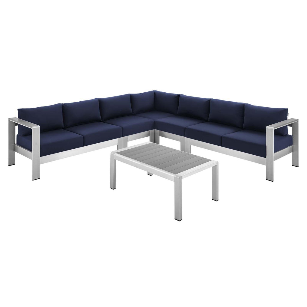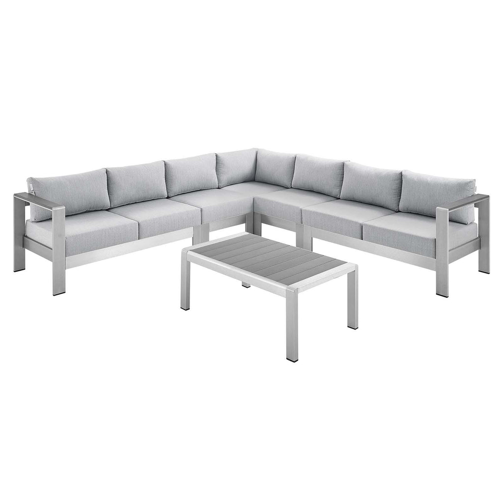 Enjoy your patio or backyard leisure time with the strong and durable Shore Outdoor Patio Aluminum 6 Piece Sectional Sofa Set. Made with anodized brushed aluminum frames and non-marking black plastic foot caps, Shore comes outfitted with resilient Sunbrella� fabric canvas cushions tested to last through all weather conditions. The Shore Outdoor Sectional Sofa Set complements your casual gatherings with a look and functionality you can rely on. Set Includes: 1 Left-Arm Sofa, 1 Right-Arm Sofa, 1 Corner Chair, 2 Armless Chairs, 1 Coffee Table