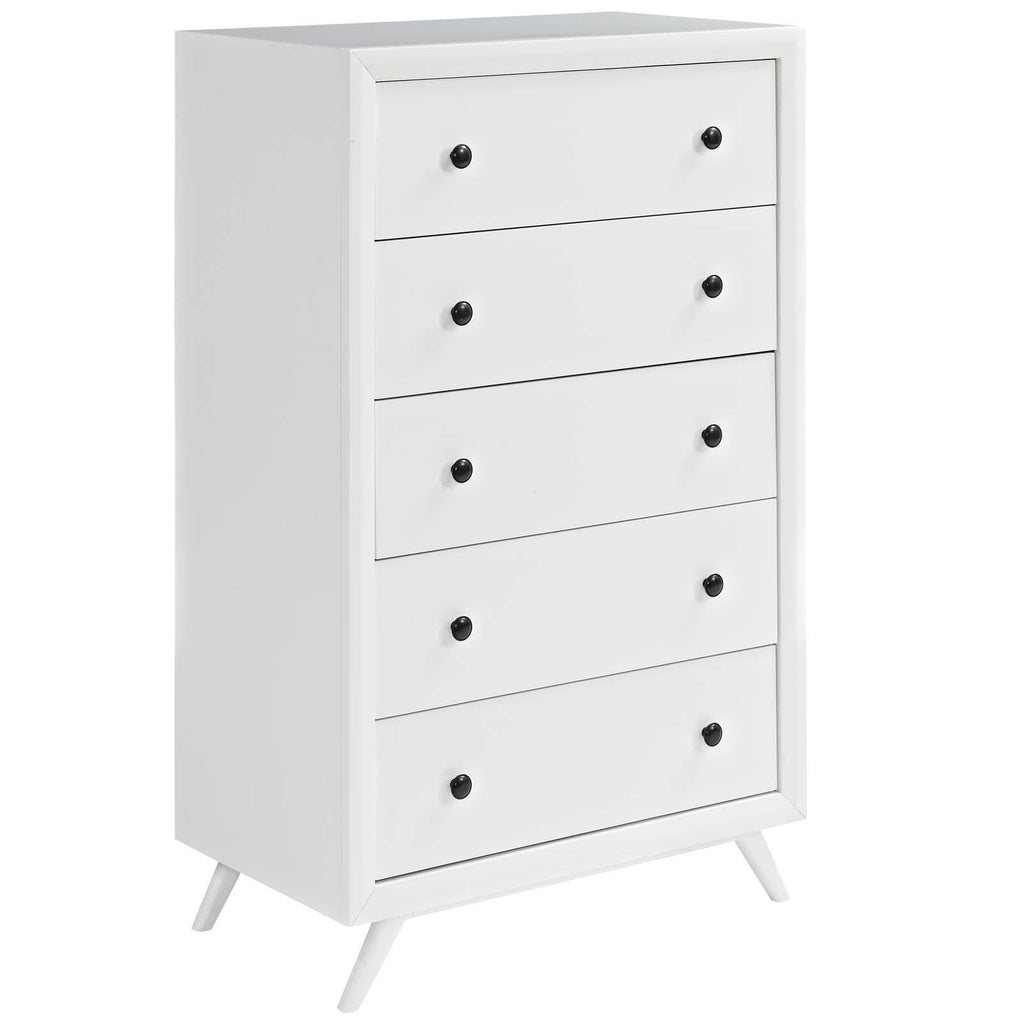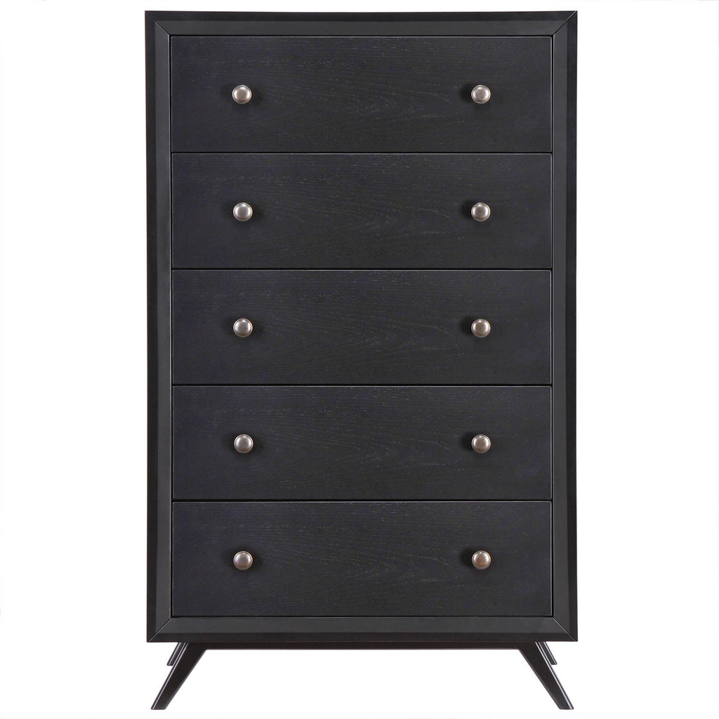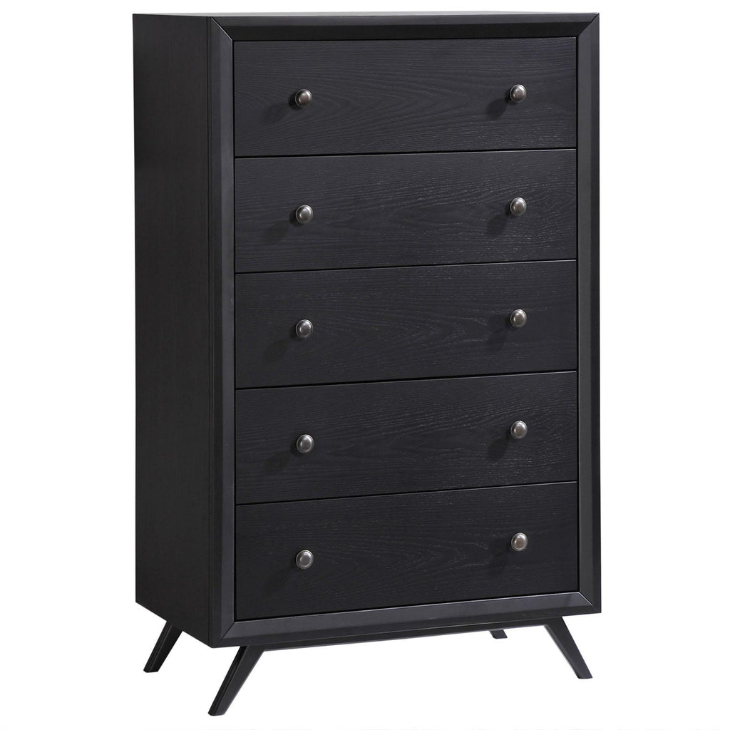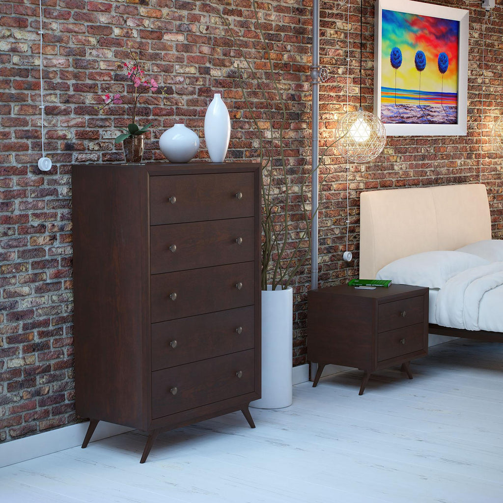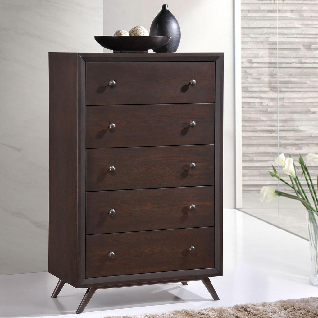 A vintage look and rich mid-century design adorn the Tracy bedroom chest. This finely crafted toffee brown stained piece comes with six easy-glide storage drawers, antique finish metal handles, and outstretched platform legs. Built upon solid edging and craftsmanship techniques, the Tracy chest requires assembly and wipes clean with a dry cloth.