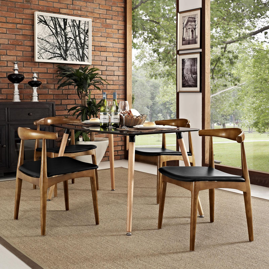 The Tracy Dining Side Chair features a mid-century slightly curved back made of wood and a foam padded seat upholstered in black leatherette. Set Includes: Four - Tracy Wood Dining Chair with Faux Leather Seat Fine Detail Stitching Leatherette Seat High-Density Foam Overall Product Dimensions: 21"L x 21.5"W x 30"H Seat Height: 17.5"L x 20.5"W x 18"H