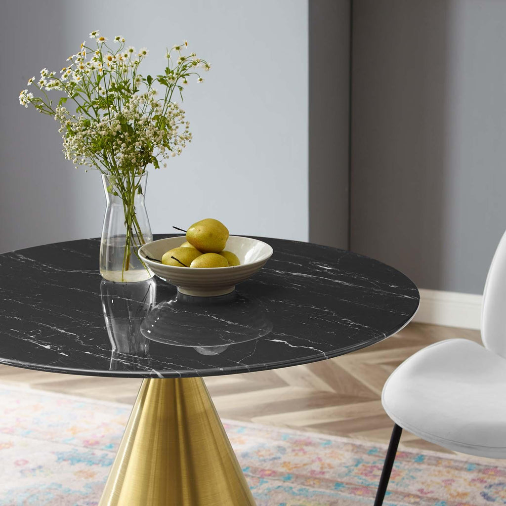 Connect with family and friends over good food and conversation with the Tupelo 36" Dining Table. Inspired by modern style and mid-century influence, this pedestal table reflects an organic shape and is perfect for entertaining or everyday dining. This dining table rests on a conical polished gold metal pedestal base and features a 36" artificial marble tabletop with an easy-to-clean finish. Non-marking ring to protect flooring. Assembly required.