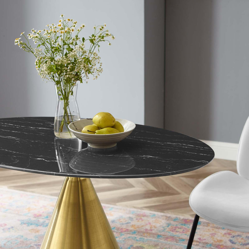 Connect with family and friends over good food and conversation with the Tupelo 42" Oval Artificial Marble Dining Table. Inspired by modern style and mid-century influence, this pedestal table reflects an organic shape and is perfect for entertaining or everyday dining. This dining table rests on a conical polished gold metal pedestal base and features a 42" artificial marble tabletop with an easy-to-clean finish. Non-marking ring to protect flooring. Assembly required.