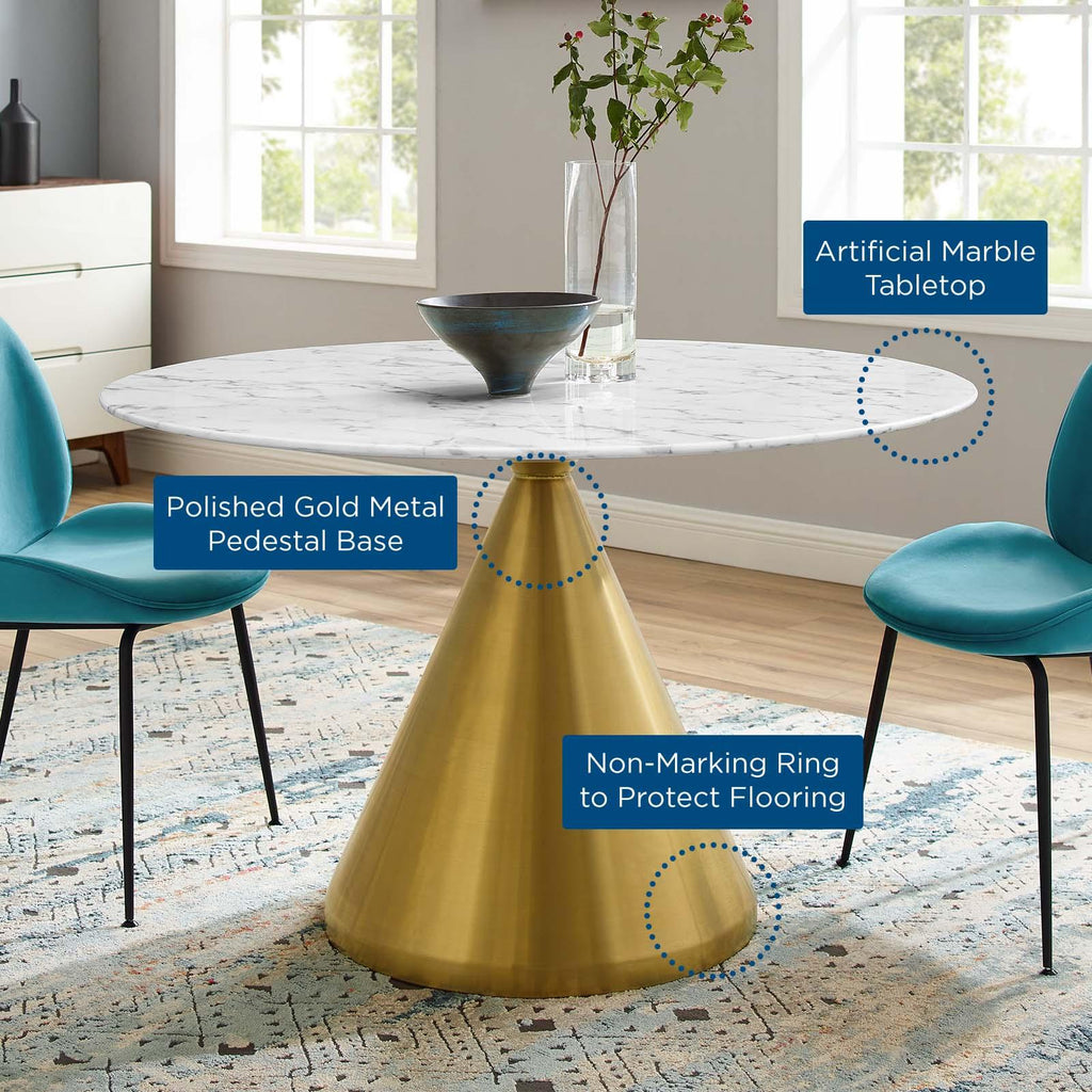 Connect with family and friends over good food and conversation with the Tupelo 47" Dining Table. Inspired by modern style and mid-century influence, this pedestal table reflects an organic shape and is perfect for entertaining or everyday dining. This dining table rests on a conical polished gold metal pedestal base and features a 47" artificial marble tabletop with an easy-to-clean finish. Non-marking ring to protect flooring. Assembly required. Set Includes: One - Tupelo 47" Artificial Marble Dining Table Modern Dining Table Artificial Marble Tabletop Polished Gold Metal Pedestal Base Non-Marking Ring Assembly Required Overall Product Dimensions: 47"L x 47"W x 29"H Floor to underside of table: 27.5"H Table Top Thickness: 1.5"H Width of Base: 23.5"W