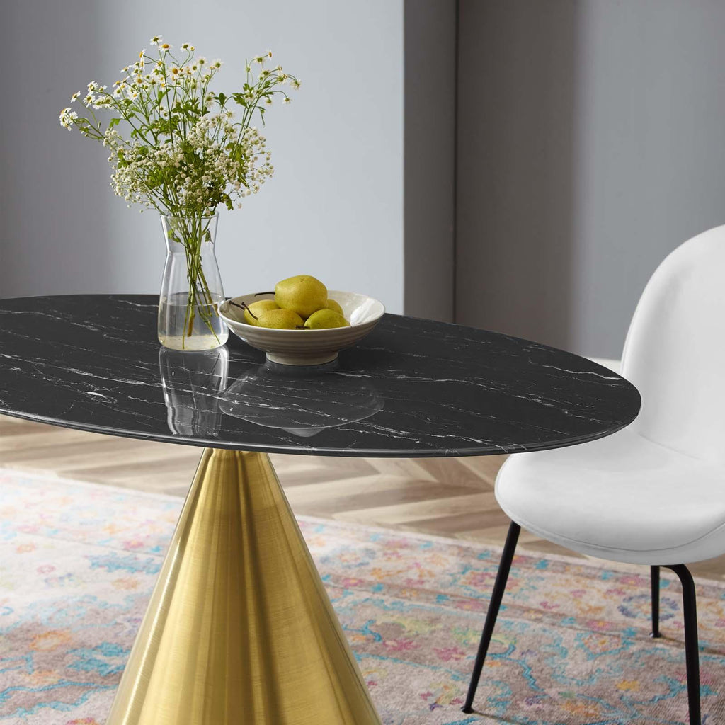 Connect with family and friends over good food and conversation with the Tupelo 48" Oval Artificial Marble Dining Table. Inspired by modern style and mid-century influence, this pedestal table reflects an organic shape and is perfect for entertaining or everyday dining. This dining table rests on a conical polished gold metal pedestal base and features a 48" artificial marble tabletop with an easy-to-clean finish. Non-marking ring to protect flooring. Assembly required.
