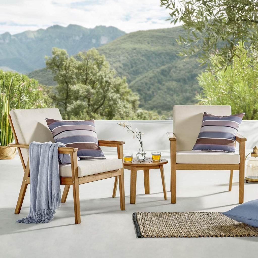 Coastal accents abound in the Vero Outdoor Patio Armchair Set with Side Table. Crisp lines formed from solid FSC certified Ash wood create the ambitious silhouette of this unique patio chairs and table. Complete with a breathable woven polyester rope back, removable all-weather cushions, and a slatted wood seat for stylish and sturdy support, Vero is an ideal update for your backyard, patio, deck, poolside, balcony, or porch. Solid construction and sleek design combine to produce this versatile wooden outdoor set.