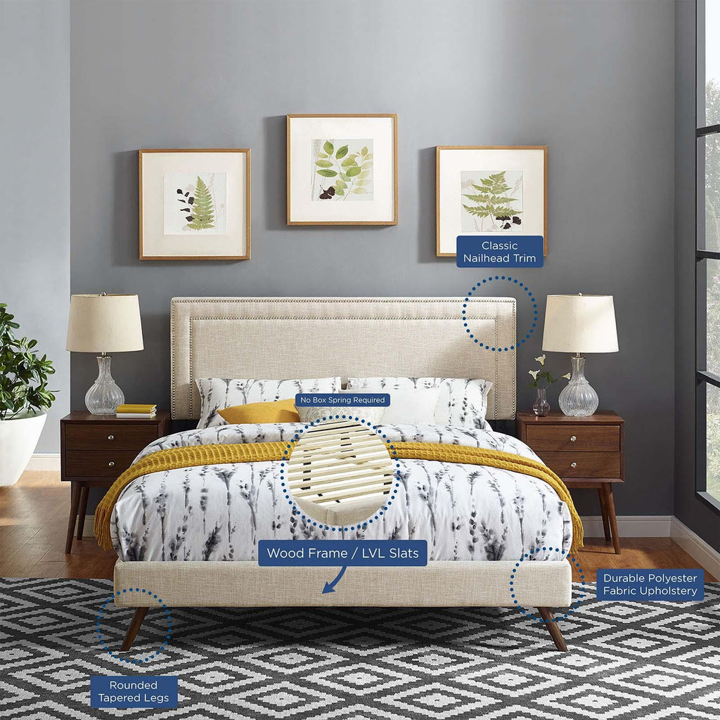 Accelerate your bedroom decor with the Virginia Platform Bed. Made with a solid wood frame upholstered in polyester fabric, Virginia features tapered wood legs, plastic foot glides, stylish headboard, and ten sturdy wood slats with a centered supporting bar and two support legs for enhanced stability. Due to the wooden slat support system, the use of a box spring is unnecessary. Virginia supports memory foam mattresses such as our Aveline series. Perfect for mid-century modern, minimalist and contemporary bedrooms. Mattress not included. Assembly Required. Set Includes: One - Jessamine King Headboard One - Loryn King Bed Frame with Round Tapered Legs Fine Polyester Upholstery Ten Wood Support Slats Wood Frame / Particleboard Panel Center Rail with Support Two Legs Mounts in Four Locations Dense Foam Padding Non-Marking Foot Glides Overall Product Dimensions: 86"L x 79.5"W x 40"H Bed Inner Size: 77"L x 81.5"W Longboard Size: 81.5"L x 6"W x 1"H Shortboard Size: 79.5"L x 6"W x 2.5"H Overall Headboard Dimensions: 3"L x 79.5"W x 40"H