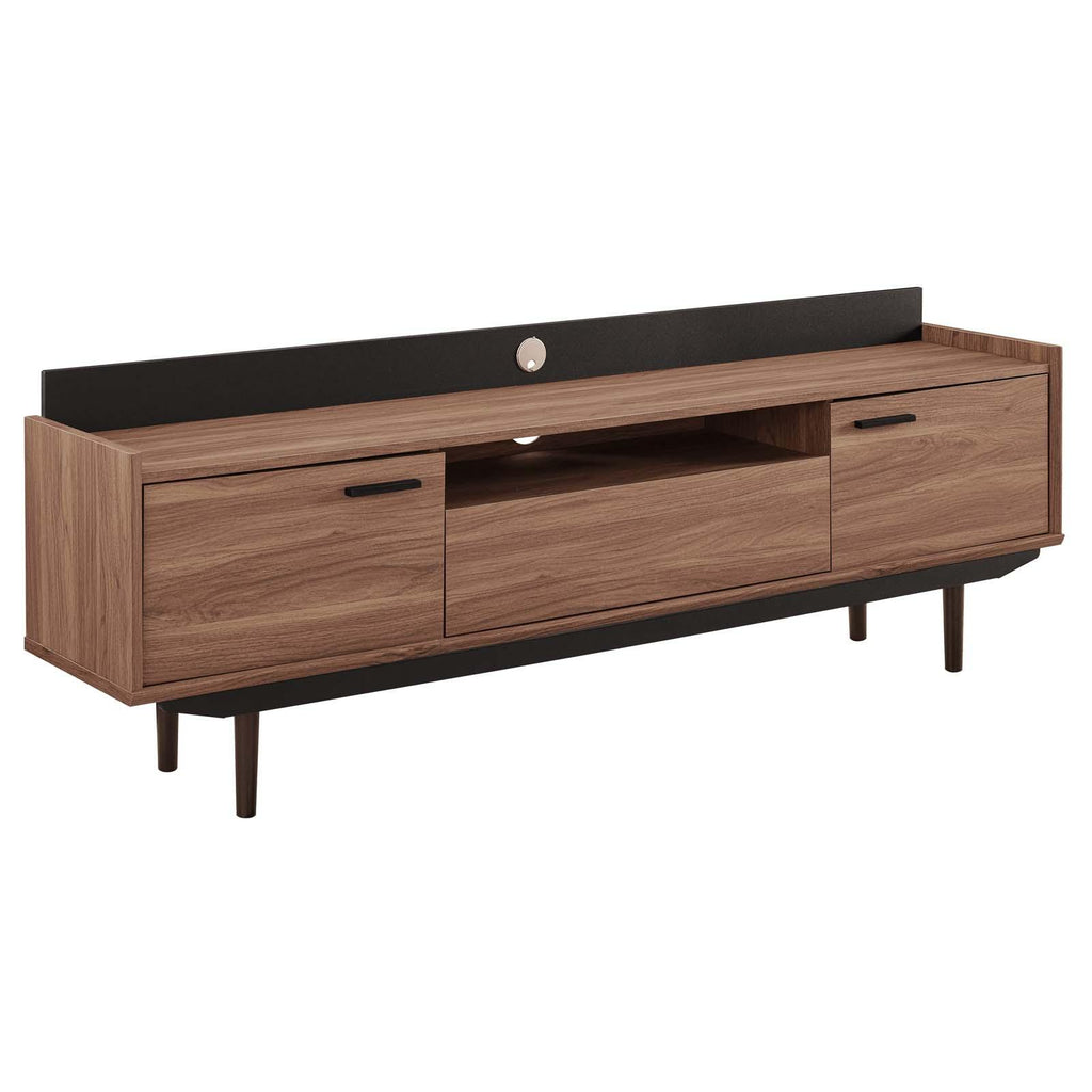 Inspire mid-century style in your living space with the Visionary 71" TV Stand. Featuring a linear silhouette with clean lines and edges, this TV stand comes with smooth walnut grain laminate, a durable particleboard frame, matte black metal hardware, four sleek and sturdy legs, a full-extension center drawer with shelf on top, and shelving units on either side with hinged wood doors for sophisticated media storage. Complete with upper and lower level cable management holes, Visionary's contemporary linear style is the perfect addition to the modern living room, lounge or recreation area. Accommodates up to 78" TVs.