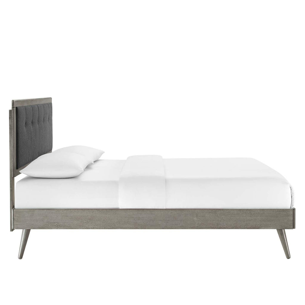 Refresh your master bedroom or guest room with the modern style, retro detail, and organic aesthetics of the Willow Tufted Wood Queen Platform Bed. Inspired by mid-century style, the upholstered headboard of this queen bed frame features a beautiful wood frame that encases a button tufted design. This platform bed frame is a sturdy addition to the bedroom with a durable wood, MDF, and veneer construction and splayed rubberwood legs. Eliminating the need for a box spring, this queen bed is complete with a wood slat support system, reinforced center beam, and supporting legs that make it a lasting mattress foundation for memory foam, latex, innerspring, and hybrid mattresses. Assembly required. Queen Bed Frame Weight Capacity: 601 lbs. Set Includes: One - Draper Tufted Queen Headboard One - Margo Queen Platform Bed Frame Queen Platform Bed Frame Tufted Upholstered Headboard "Wood, MDF, and Veneer Construction" Wood Slat Support System Rubberwood Legs Assembly Required Weight Capacity: 601 lbs. Overall Product Dimensions: 83"L x 63.5"W x 41 - 51"H Overall Bed Frame Dimensions: 82.5"L x 63.5"W x 15"H Footboard Dimensions: 0.5"L x 63.5"W x 6"H Side Rail Dimensions: 82.5"L x 0.5"W x 6"H Inner Bed Size: 81"L x 62"W Leg Dimensions: 2.5"L x 2.5"W x 11"H Overall Headboard Dimensions: 0.5"L x 61"W x 41 - 51"H Headboard Dimensions: 0.5"L x 61"W x 22.5"H Distance Between Slats: 3.5"L